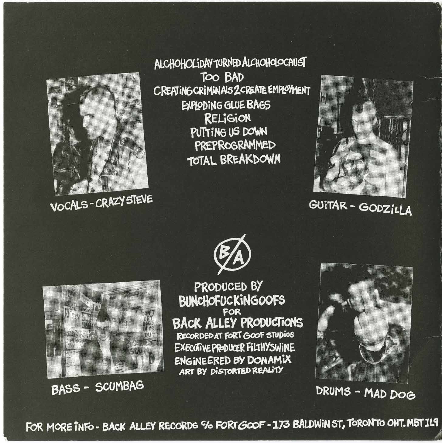 The band became notorious for its confrontational live performances, heavy alcohol consumption, and frequent conflicts both on and off stage. This reputation extended to their audience and contributed to their status as one of the most polarizing acts in Canadian hardcore. During the late 1980s, Bunchofuckingoofs released material on God Records and Fringe Product, placing them alongside labelmates such as the Dayglo Abortions within Canada’s most extreme punk output of the era.