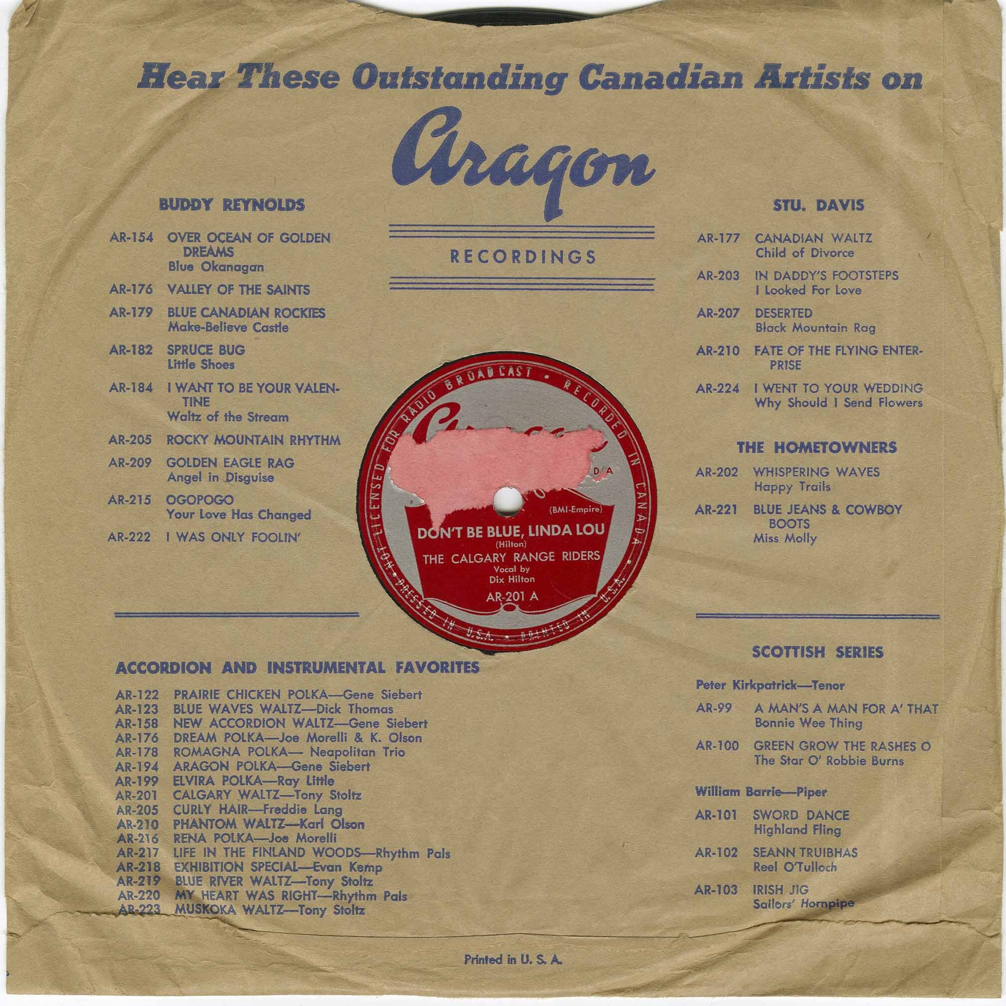 The Range Riders recorded for both Aragon Records in Vancouver and Apex Records in Toronto. Their Aragon debut (catalog 201) paired “Don’t Be Blue, Linda Lou” with “Calgary Waltz,” followed by “Orange Blossom Special” / “Too Old to Be Young Anymore.” On Apex, they issued “Thousand Miles at Sea” / “Careless Ways” and “Reward” / “Midnight Waltz.” Hilton wrote most of the group’s material and claimed to have composed over two hundred songs, many inspired by prairie life and maritime imagery from his years stationed on Canada’s coasts.