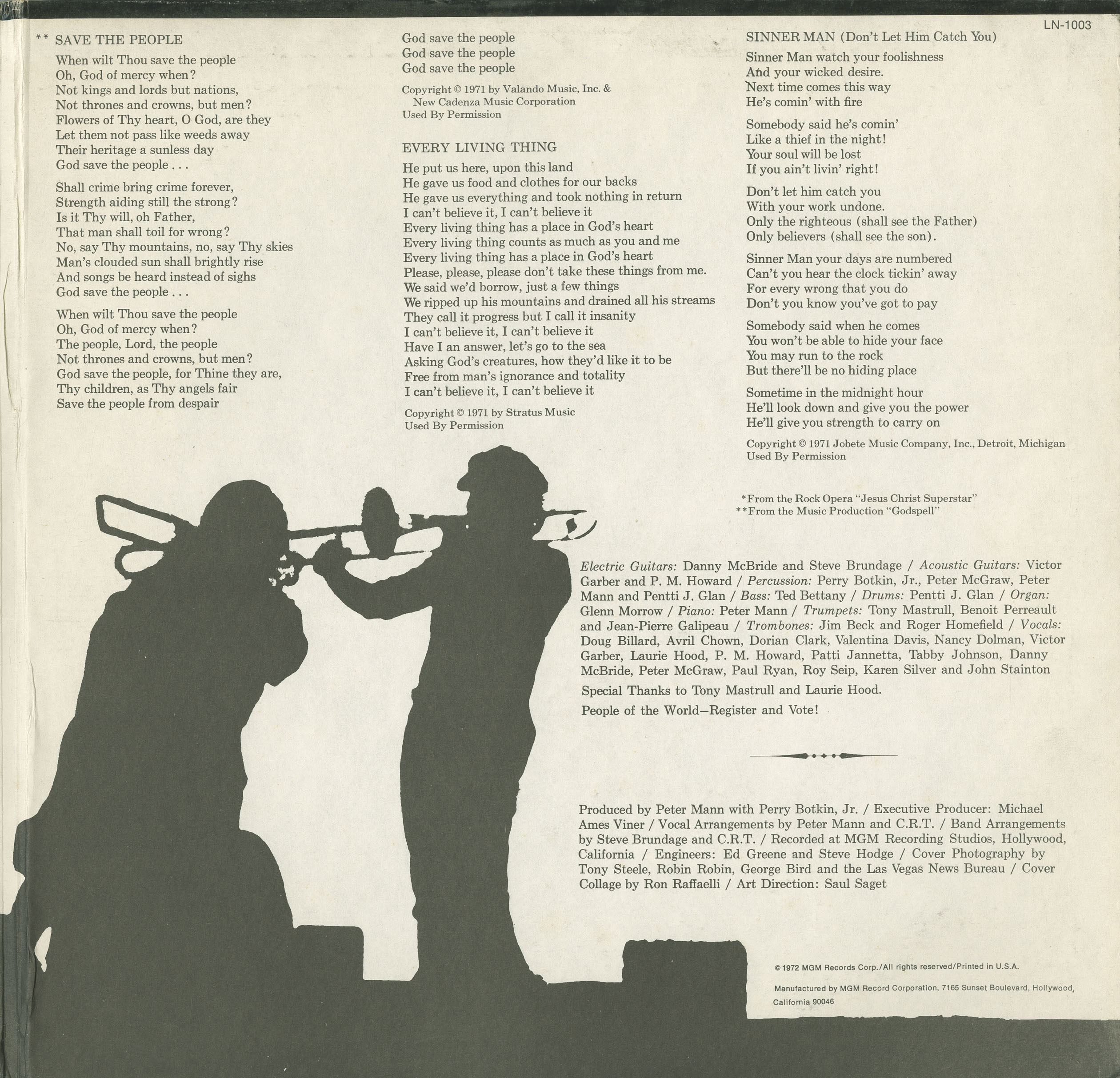 Their self-titled album, released in 1972 on Lion Records, captured the spirit of the era with a mix of original songs and covers of contemporary rock musicals such as Jesus Christ Superstar and Godspell. The ensemble was produced by Peter Mann and Perry Botkin Jr., with arrangements by Steve Brundage and engineering by Ed Greene and Steve Smith, recorded at MGM Recording Studios in Hollywood, California.