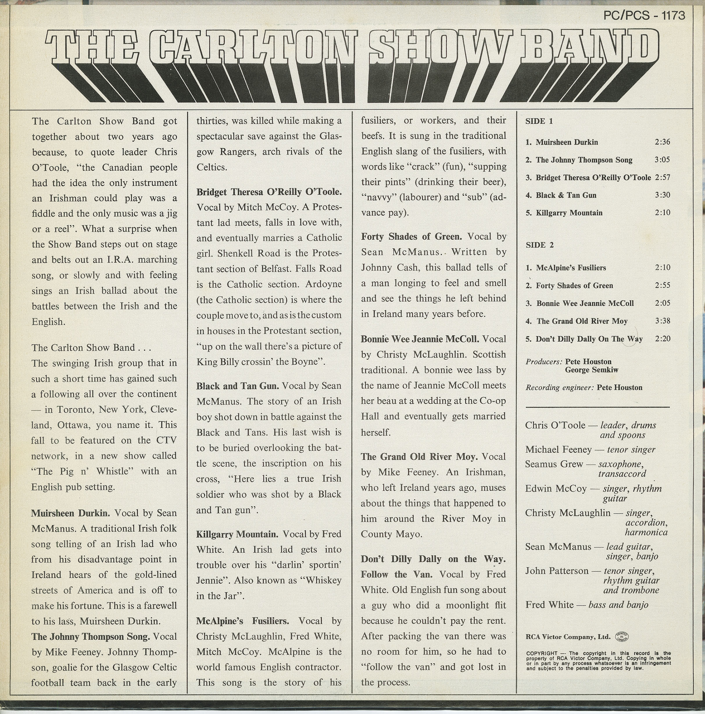 The Carlton Show Band got together about two years ago because, to quote leader Chris O’Toole, “the Canadian people had the idea the only instrument an Irishman could play was a fiddle and the only music was a jig or a reel”. What a surprise when the Show Band steps out on stage and belts out an I.R.A. marching song, or slowly and with feeling sings an Irish ballad about the battles between the Irish and the English.