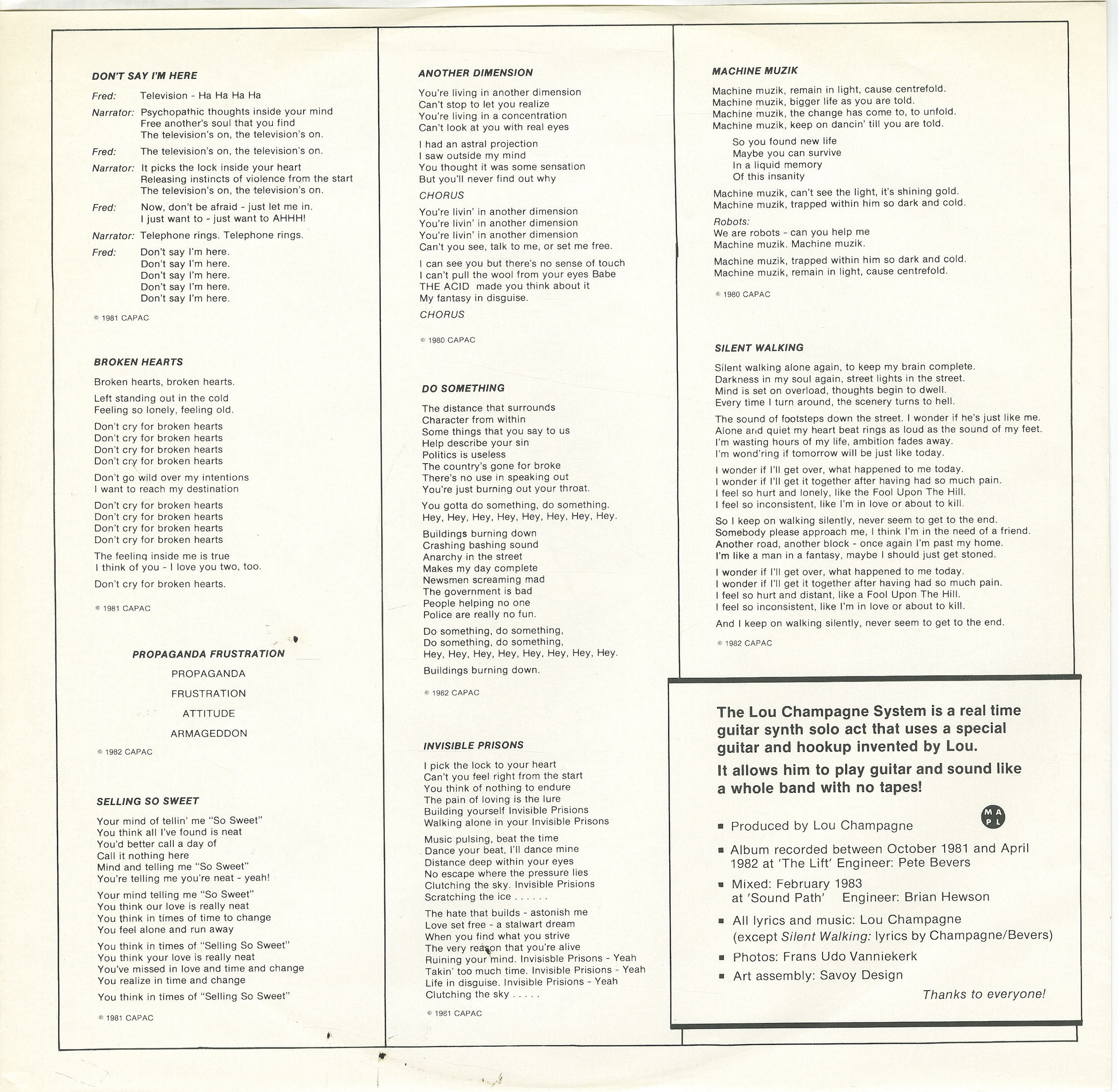 liner notes: The Lou Champagne System is a real time guitar synth solo act that uses a special guitar and hook up invented by Lou. It allows him to play guitar and sound like a whole band with no tapes!