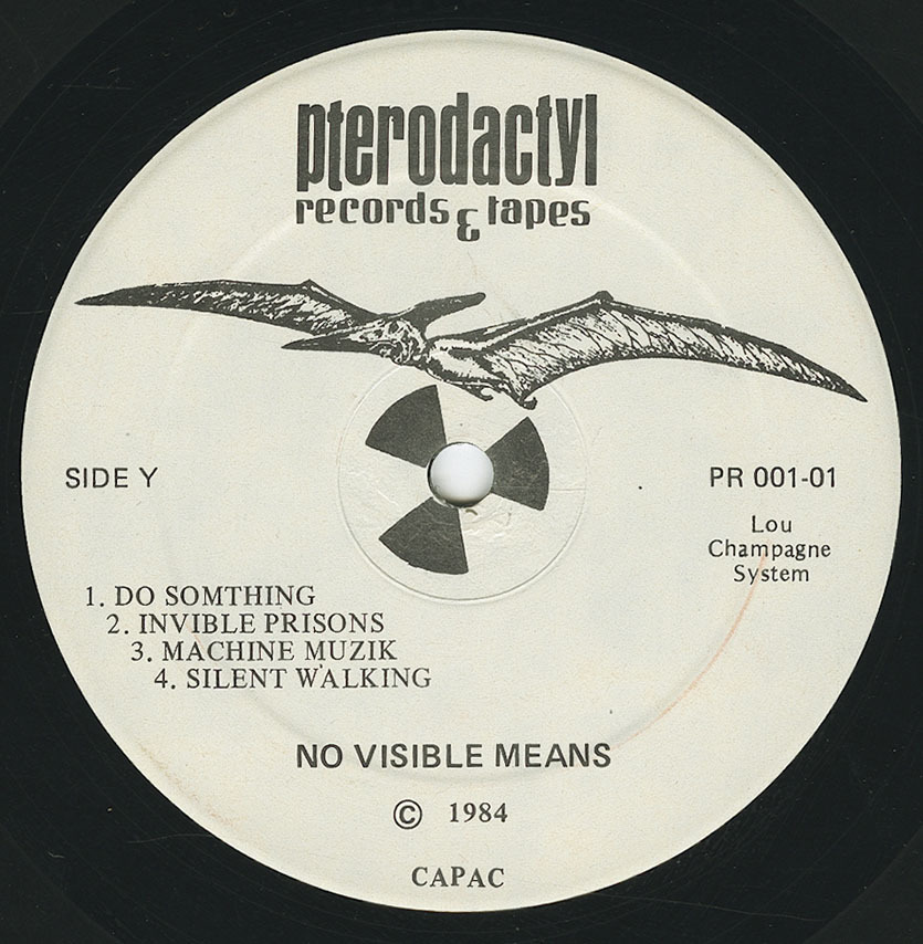 Canadian post-punk classic by one-man synth, guitar and syn-drum band, Lou Champagne System. 'No Visible Means' was privately pressed on Lou's Ontario-based Pterodactyl Records in 1983. Over nine tracks he serves an impressively diverse array of post-punk styles, from more jagged guitar-driven wave pop to slicker electronic disco with a slightly daft but endearing darkside lyrical rhetoric. It's the latter styles which make up the highlights, including one in particular 'Propoganda Frustration', a standout piece of arpeggiated disco bass and tortured vox with a shifty patina of dubbed-out guitar primed for the darkest dancefloors. Equally on a dry, motorik minimal tip, there's the excellent 'Silent Walking', while the rest tends towards spikier punk modes, like the propulsive guitar and rushing machine rhythm vectors of 'Another Dimension' and the snotty fury of 'Do Something'.