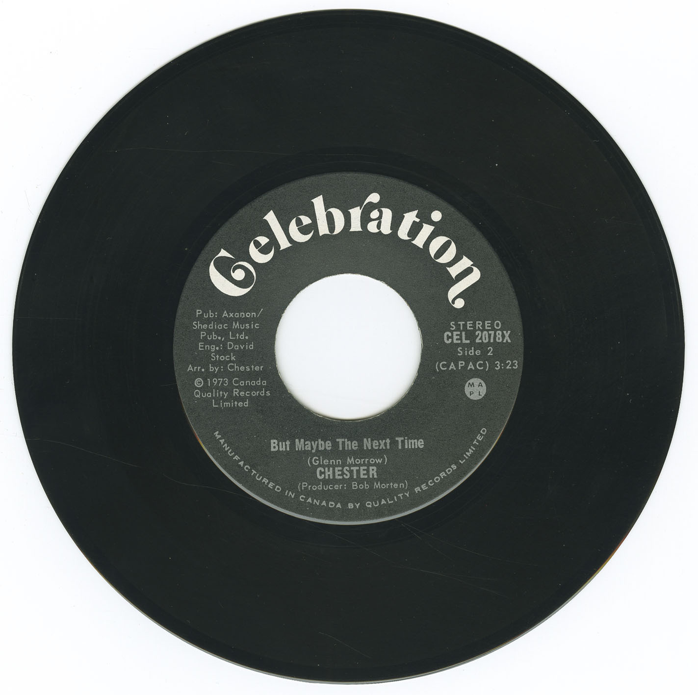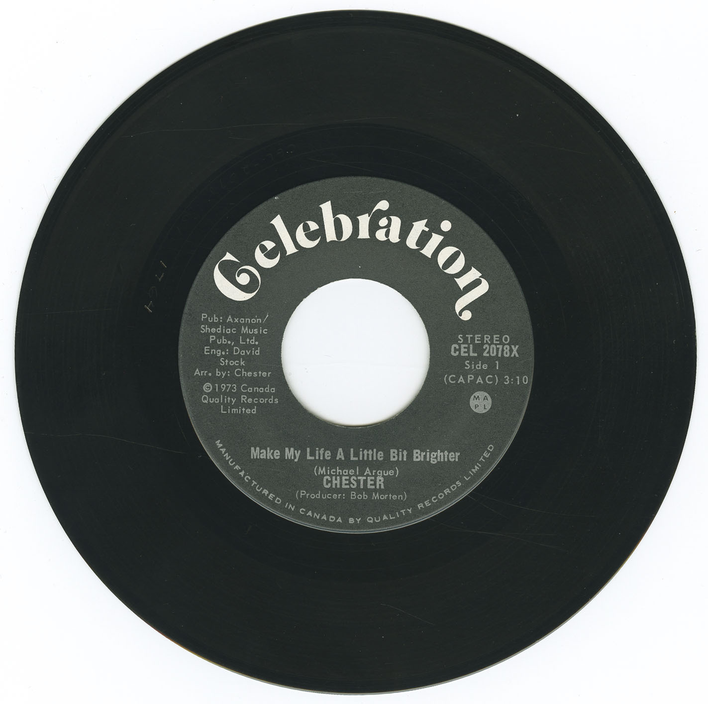 Chester was a Toronto-based pop rock group formed in 1972 by keyboardist and arranger Glen Morrow, vocalist Jim Mancel, guitarist and vocalist Mike Argue, bassist Mel O’Brien, and drummer Glen “Wedge” Monroe. Morrow had already established himself as one of the city’s most skilled Hammond B-3 players through earlier work with the Bluenotes, T.K.’s, and Tarot. Signed to the Celebration label, a Quality Records imprint, the band released its debut single “Make My Life a Little Bit Brighter” b/w “But Maybe the Next Time” (CEL 2078X) in 1973. Written and sung by Argue, the single was produced by Bob Morten, engineered by David Stock at RCA Studios in Toronto, and arranged by the band. The record carried full MAPL Canadian content designation and was published by Axanon and Shediac Music.