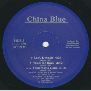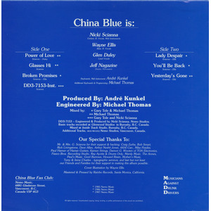 Their self-titled China Blue mini-album, released independently in 1987, remains the band’s definitive recorded statement—a seven-track collection of melodic hard rock marked by soaring vocals, thick synth textures, and tightly arranged guitar work. The album was recorded at Glenwood Studios in Burnaby and mixed at several Vancouver-area studios. It was produced and engineered by André Kunkel, with additional contributions from Michael Thomas, Nicki Scianna, and Gary Tole. Highlights include “Power of Love”, “Broken Promises”, and the emotionally driven “You’ll Be Back.”