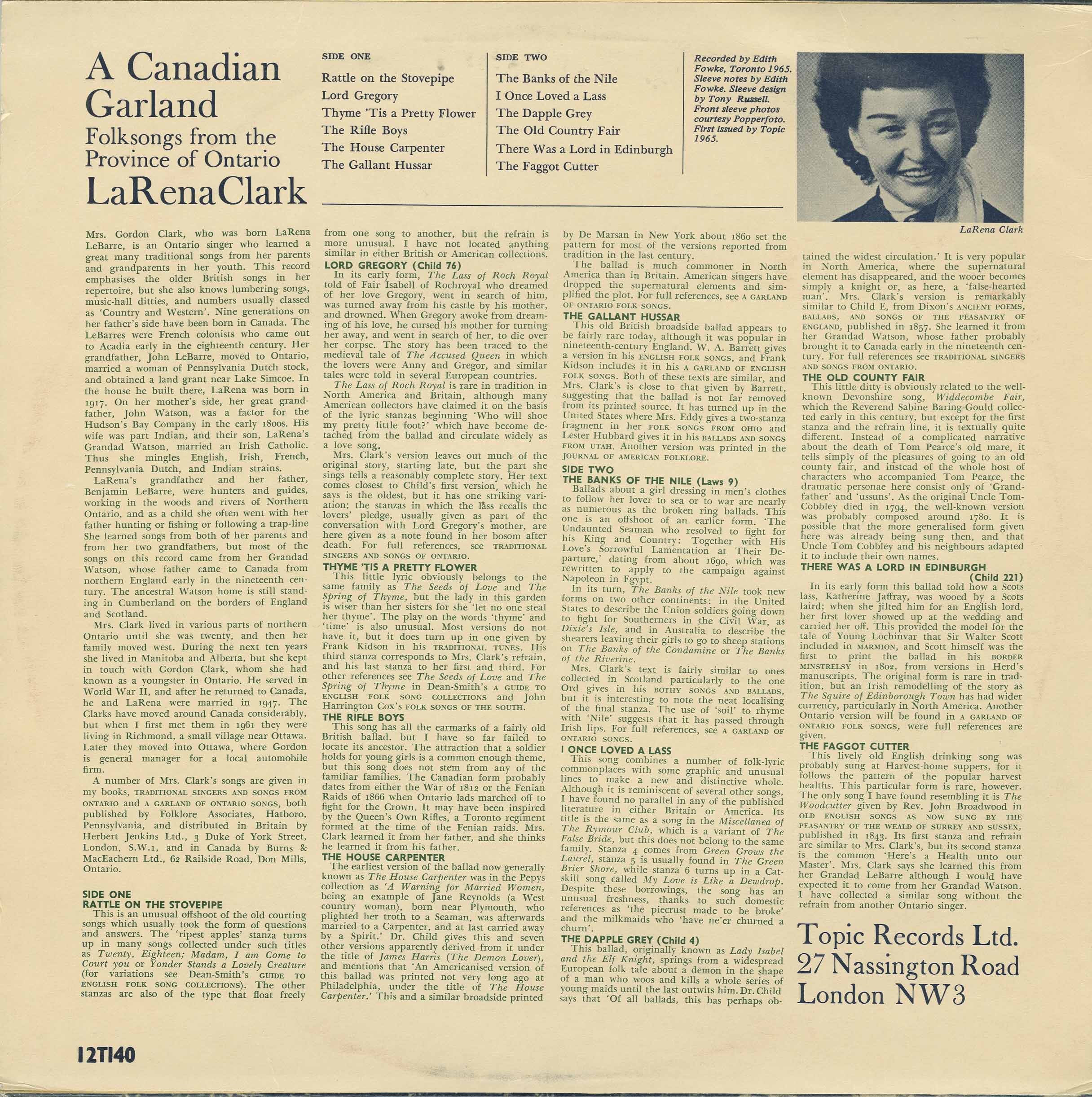 Mrs. Gordon Clark, who was born LaRena LeBarr, is an Ontario singer who learned a great traditional song from both her parents and grandparents in her youth. This record emphasizes the older British songs and recitations, but she also knows lumbering songs, local ballads, and semi-improvised comical songs concerned with animals and neighbours. Her father and she have been in contact with the LaRena's since French colonists who came to Canada early in the nineteenth century. The Clarks, originally from the Ottawa Valley, moved to Huntsville in Muskoka, Ontario, near Lake Simcoe, and obtained a land grant near Lake Simcoe. In those wooded hills, great log jams stood in boom towns; when these broke, as on the great log jam on Deep Bay (Cannington), they sent logs into a vast pond landing in the rich Lake Simcoe clay. This pond is now used by the Ontario Fish Hatchery.