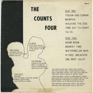 The Counts Four are a triple treat group: they play solos…duets…blues or rock n’ roll. This LP certainly shows that they have created their own special brand of driving music. Theirs has been a short but phenomenal career. From one night stands and school hops to top engagements throughout Canada and the United States all in the space of one year. Here are four young men with a big musical message who are going places…..but fast!