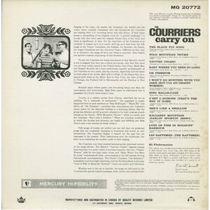 By 1961–62, management and bookings began pulling them beyond Ottawa into Montréal club work, U.S. college dates, and industry auditions in New York. When Mirsky left, the Courriers found a remarkable replacement in Jean Price, whose presence added a true ballad voice and expanded the group’s range. With Price, the Courriers cut their debut album for Mercury, The Courriers Carry On (recorded in 1962; issued 1963), a high-energy set that moved confidently through traditional material, gospel, and international folk themes. It was the record that introduced many listeners to the group—particularly via “Sing Hallelujah”—and it remains their most celebrated and sought-after release, prized for its speed, clarity of diction, and “build to the climax” vocal arranging that made the trio sound larger than it was.