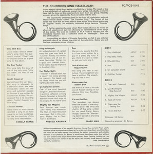 By 1961–62, management and bookings began pulling them beyond Ottawa into Montréal club work, U.S. college dates, and industry auditions in New York. When Mirsky left, the Courriers found a remarkable replacement in Jean Price, whose presence added a true ballad voice and expanded the group’s range. With Price, the Courriers cut their debut album for Mercury, The Courriers Carry On (recorded in 1962; issued 1963), a high-energy set that moved confidently through traditional material, gospel, and international folk themes. It was the record that introduced many listeners to the group—particularly via “Sing Hallelujah”—and it remains their most celebrated and sought-after release, prized for its speed, clarity of diction, and “build to the climax” vocal arranging that made the trio sound larger than it was.