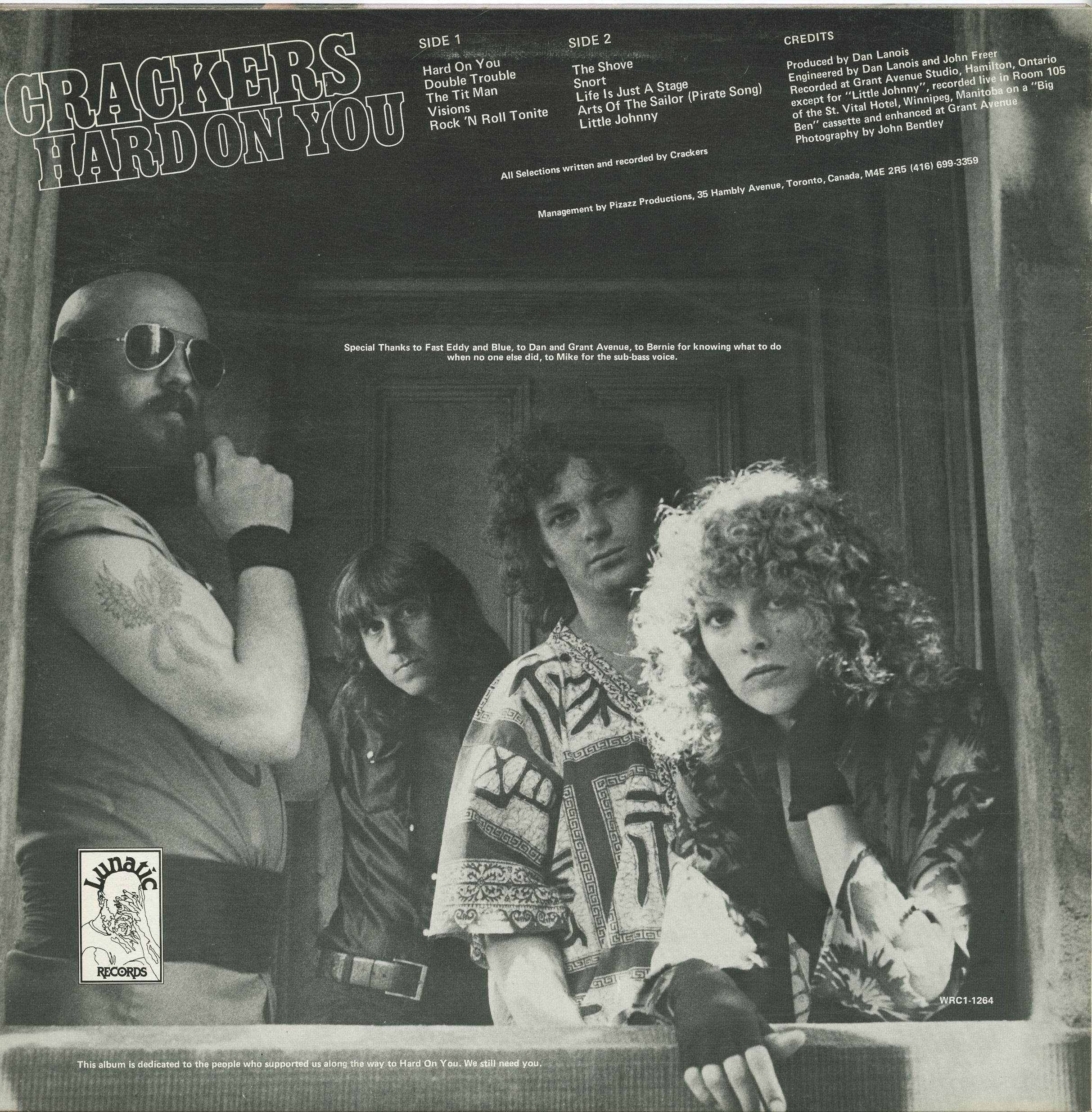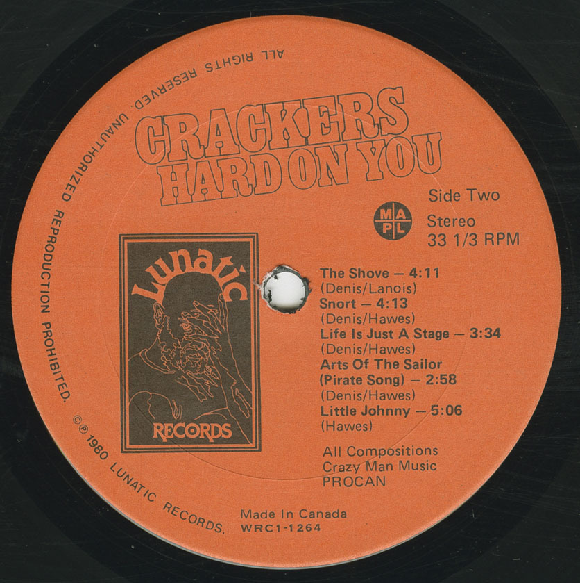 Crackers returned to Grant Avenue for Hard On You in 1980, again with Lanois engineering and co-producing. Released on Denis’ own Lunatic Records label in partnership with World Records (catalog number WRC1-1264), the album refined the group’s delivery without losing their wild edge. Tracks including “Double Trouble,” “Visions,” and the talk-box opener “Crackers in Concert” became staples across the Canadian university and festival circuit.