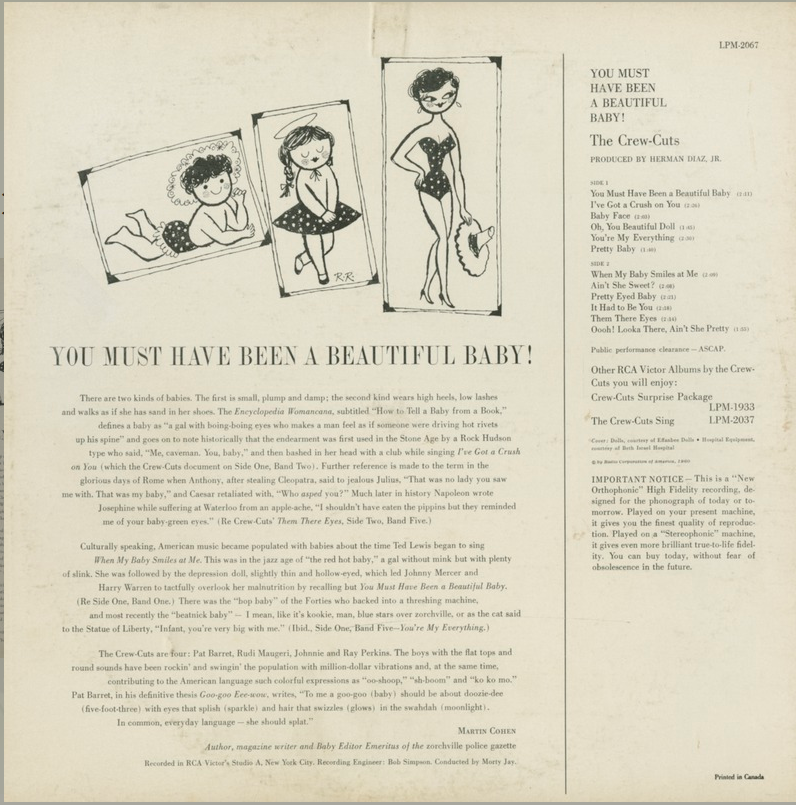 Culturally speaking, American music became populated with babies about the time Ted Lewis began to sing When My Baby Smiles at Me. This was in the jazz age of “the red hot baby,” a gal without mink but with plenty of slink. She followed by the depression doll, slightly thin and hollow-eyed, which led Johnny Mercer and Harry Warren to tactfully overlook her malnutrition by recalling You Must Have Been a Beautiful Baby. (Re Side One, Band One.) There was the “bop baby” of the Forties who backed into a threshing machine, and most recently the “beatnik baby”—a man, like it’s kookie, man, blue stars over zorchville, or as the cat said to the Statue of Liberty, “Infant, you’re very big with me.” (Ibid., Side One, Band Five—You’re My Everything.)