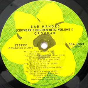 Musical differences severed ties between Newell and the band the next year however, and Crowbar set sail to England to prepare for the next album. Recorded in Mike Oldfield's English castle, BAD MANORS was released in the spring of '71. The first single epitomized the care-free hippie generation of the day, and "Oh What A Feeling" soared up the charts. This was the first single released after government regulations requiring Canadian radio stations to play one-third homegrown material had come into effect. The single quickly reached gold here, but due to the drug annotations in the song, it didn't receive airplay in the US. Other noteable songs included the 'b' side "Murder In The First Degree", the cover of The Yardbirds' "Train Kept a Rollin'" and the other singles "Happy People" and "Too True Mama".