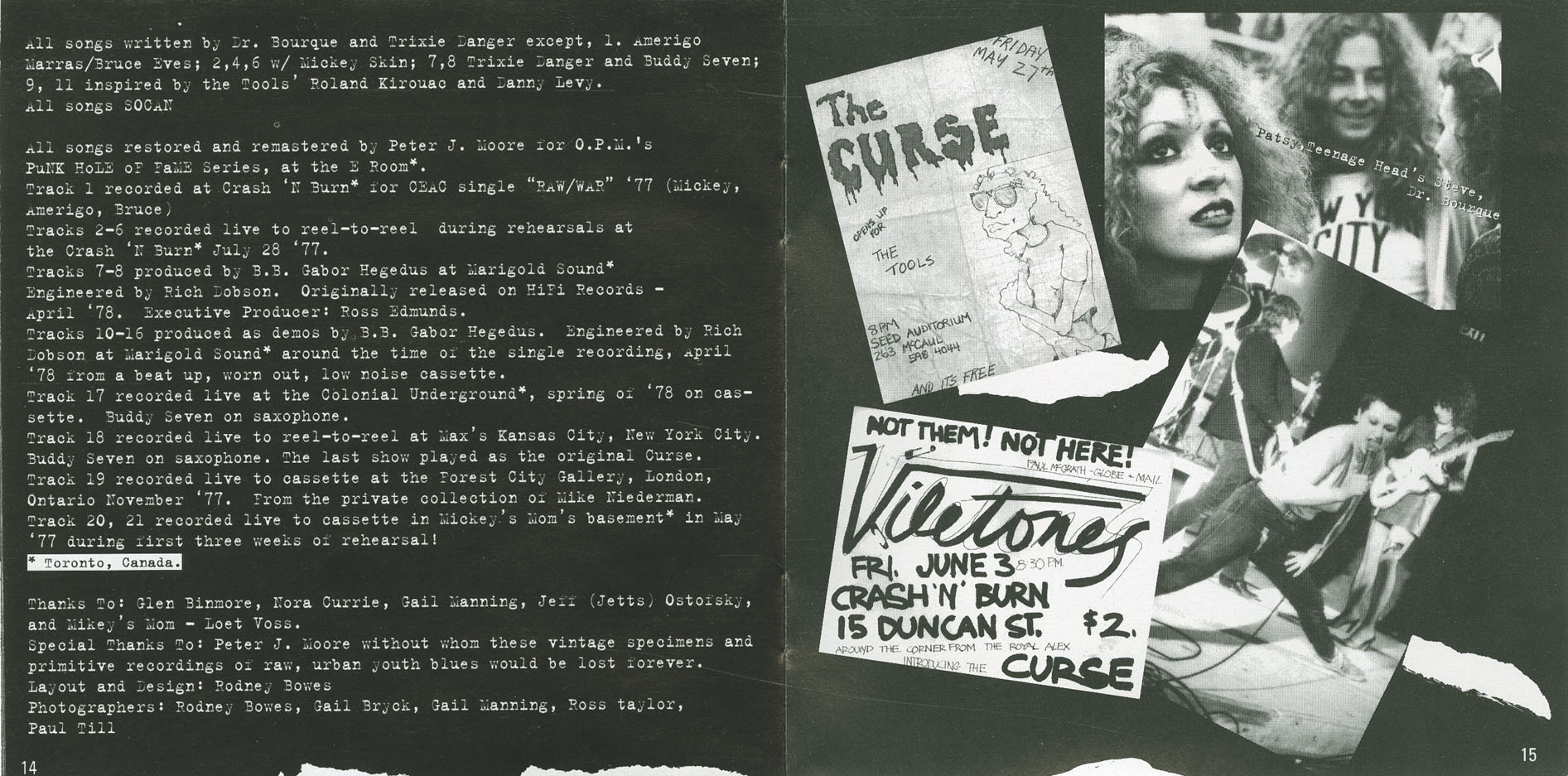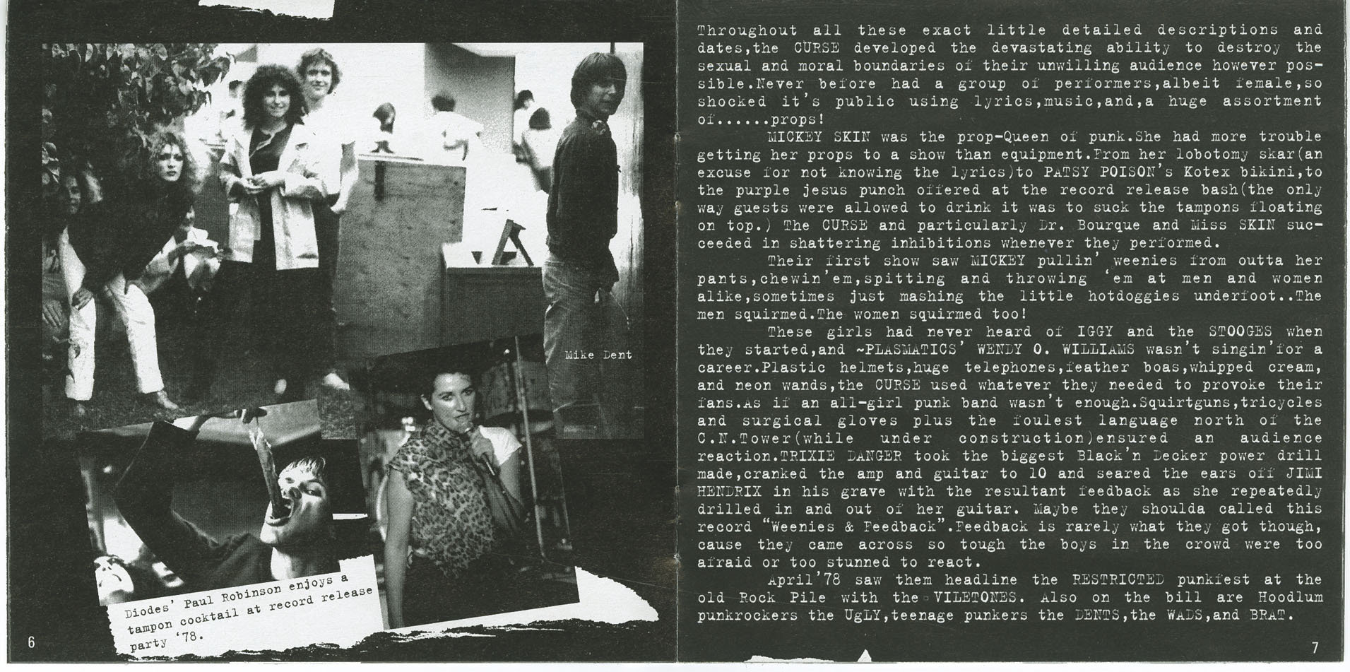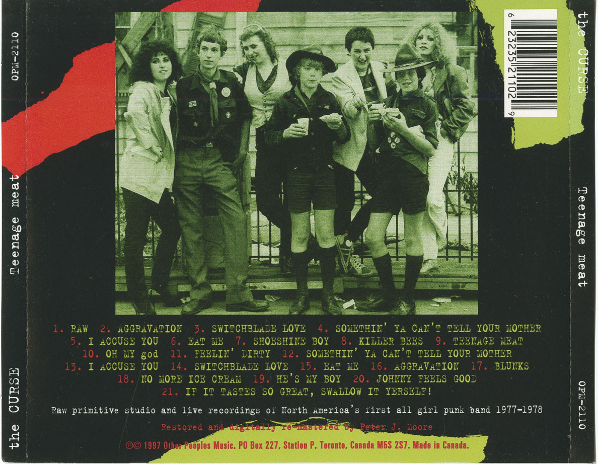 The Curse continued playing around Toronto — David’s, the Horseshoe, Turning Point, Shubert’s Cabaret, the Colonial Underground — sharing bills with acts like the Battered Wives, Androids, Dents, Teenage Head, and Diodes. Their antics drew as much backlash as admiration. During a performance at London, Ontario’s Forest City Gallery (Nov. 25, 1977), hostile local punks welcomed them with hurled steaks and rotting food. Still, they played three full sets of their eight songs, in three different orders.