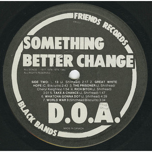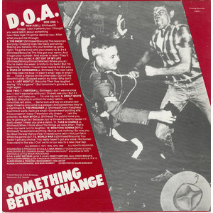 About time! For nearly two decades since they went out of print, the first two classic punk DOA LPs were bowdlerized into Bloodied But Unbowed, and then, to address the numerous songs regrettably removed in the process, the Polish import (!) non-LP Greatest Shits appeared. Yet, when one considers how revolutionary and yet how distinct from each other those two LPs were, this state of affairs just made no sense. In an era when so few North American punk greats ever made an actual LP, how could two such crucial ones remain so unavailable for so long? Thankfully, here's the first of them, in its natural, restored state, just as it appeared in 1980 -- and how glorious it remains! The product of two years of solid gigging in their native Vancouver, by the hottest punk rock band the West Coast ever produced this side of the much different Weirdos and Avengers, Something Better Change features a trio so molten, they didn't even manage to get it all down in the studio. And yet it still is an absolutely awesome record. So heavy with chops it nearly leaks, soaring like the best Clash/Pistols/S.L.F. riffs filtered through an American anvil power even those greats couldn't approach. On the faster cuts, DOA just turn the aggression up several notches. And on the slower cuts they prove themselves as much a strong, fiery, spit-a-flyin' rock & roll band as they are a punk one. Sadly, there is only one bonus track, the also great re-recording of their first EP "Disco Sucks" as "New Wave Sucks." But for those who thought that the English had the market cornered on late-'70s punk, DOA could flat-out outplay them all, and this LP is a bomb with sociopolitical smarts and irreverent attitude.