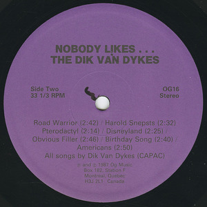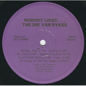 This is the debut album by Hamilton's Ambassadors of Tackiness to the World, the Dik Van Dykes. They took the underground music scene by surprise in 1986 with their detestable blend of originality and polyester, and this vinyl frisbee is just another attempt by the band to spread their warped sense of reality into every corner of Canada, and other places too. Combining the primitive pounding of Stu Smith (no kick pedal) with the sleepy bass of Frank Viola, 3 grinding strings courtesy of Steve Hoy, and the painfully harmonious bubble-rap of the internationally renowned PopTarts, Renee and Sarah, the Van Dykes create the ultimate tacky-garage-punk environment for slightly off-key lead guitarist and vocalist Dik’s satirical assault on life in general.
