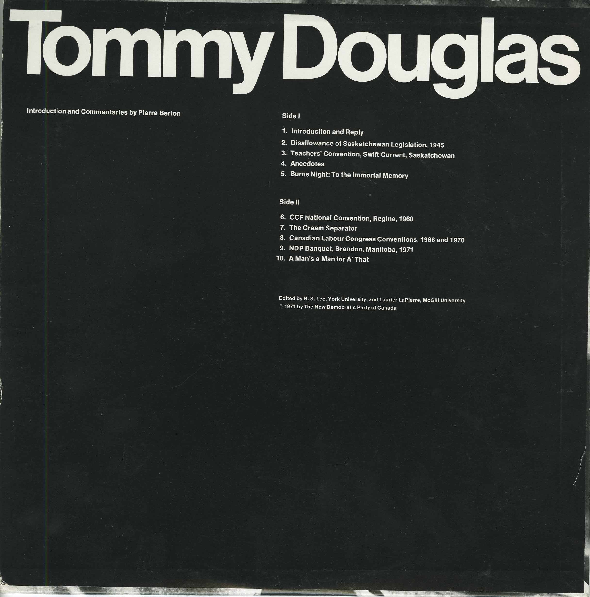 Tommy Douglas, 'The Greatest Canadian' released this album of his speeches and orations in 1971. The album was released in two versons, the standard jacket version and the boxed-set version. The boxed version came complete with a pictorial biography, a biographical essay, an 8x10 glossy photograph of Tommy Douglas and M.J. Coldwell, and a long playing record. The lp record has introductions and commentaries by Pierre Berton, and features selections from Tommy Douglas's greatest speeches and from his best-loved anecdotes and recitations, including the peroration of his 1945 speech against the attempted disallowance of Saskatchewan Legislation, portions of his adresses to the Canadian Labour Congress Conventions of 1968 and 1970, and his recitation of Burns's "A Man's a Man for A That", featured here. The record was edited by Laurier LaPierre and H.S. Lee.