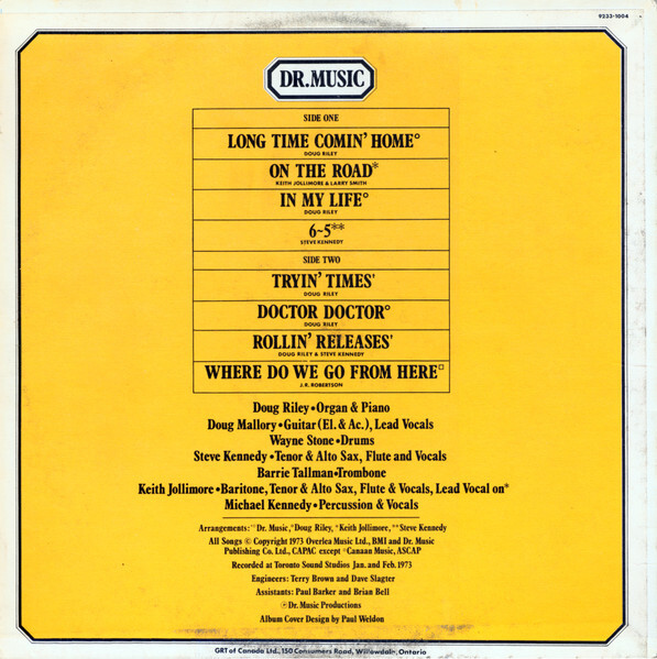Written by Doug Riley ('Long Time Comin' Home', 'In My Life', 'Tryin' Times', 'Doctor Doctor', 'Rollin' Releases'); Keith Jollimore and Larry Smith ('On The Road'); Steve Kennedy ('6-5', 'Rollin' Releases'); Robbie Robertson ('Where Do We Go From Here')