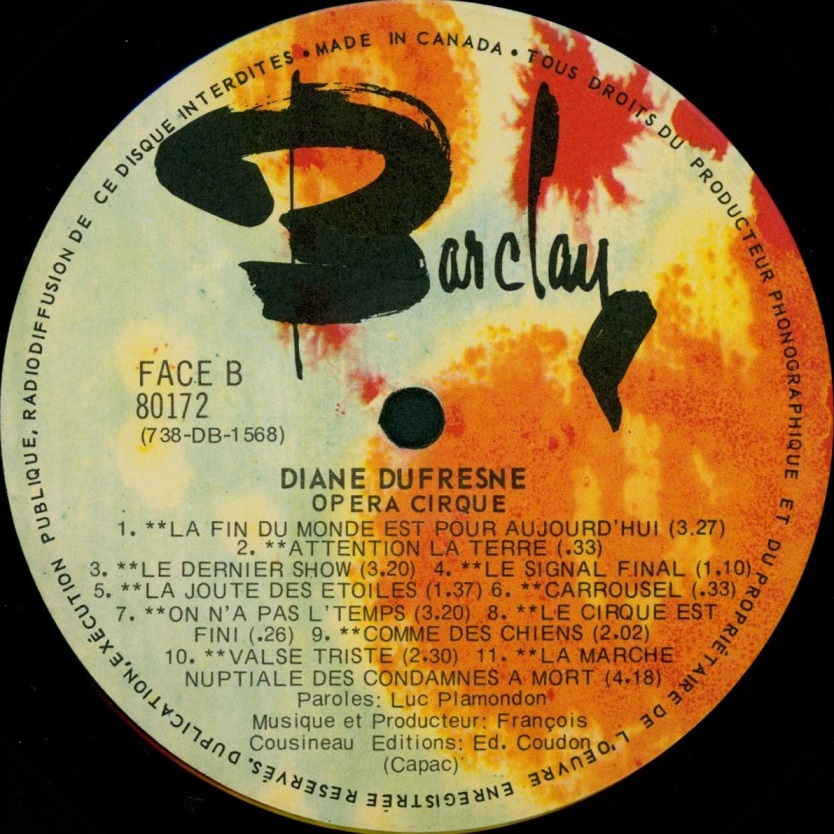 Diane Dufresene's recording career began with an obscure single in 1970, and her first real break came with her recording on the erotic underground soundtrack l'Intiation in 1969......but Quebec's most eclectic Diva was really born in 1972 with her total metamorphosis into a flamboyant and theatrical persona which arrived coincident with the release of her first LP Tiens-Toé Ben J'arrive (her first solo collaboration with Francois Cousineau).