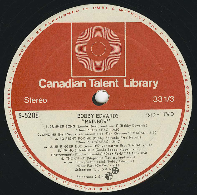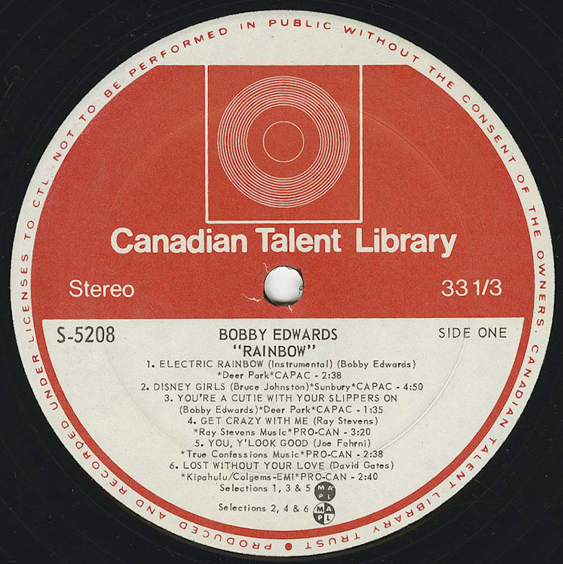At the same time, Edwards built a parallel career as an arranger, writer, and bandleader, most visibly through his work for the Canadian Talent Library. His 1972 CTL album Fat City Suite in E Major, credited to Bobby Edwards & the Fat City Guitars, introduced an ambitious multi-guitar ensemble supported by reeds, vibes, harmonica, and rhythm section—an atmospheric mix of pop, jazz, and light funk that became one of CTL’s most distinctive releases. Other CTL projects soon followed, including the big-band-with-strings outing Rainbow and the instrumental showcase Guitars, Guitars, later issued by Attic Records. These albums captured the side of Edwards that most casual listeners never heard: a writer with a deep harmonic sense and the ability to shape a large ensemble around the voice of his own guitar.