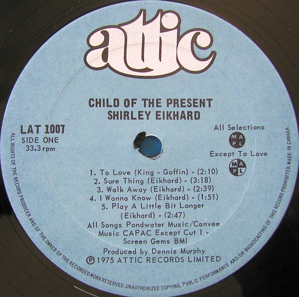 Child of the Present is a studio album by Canadian singer-songwriter Shirley Eikhard, released in 1975. The album produced the singles ‘Play a Little Bit Longer,’ ‘Sure Thing,’ and ‘I Just Wanted You to Know,’ all of which reached the Canadian Top 40. The record documents a transitional period in Eikhard’s career, balancing singer-songwriter intimacy with polished studio arrangements, and contributed to contemporary comparisons with artists such as Carole King and Anne Murray.