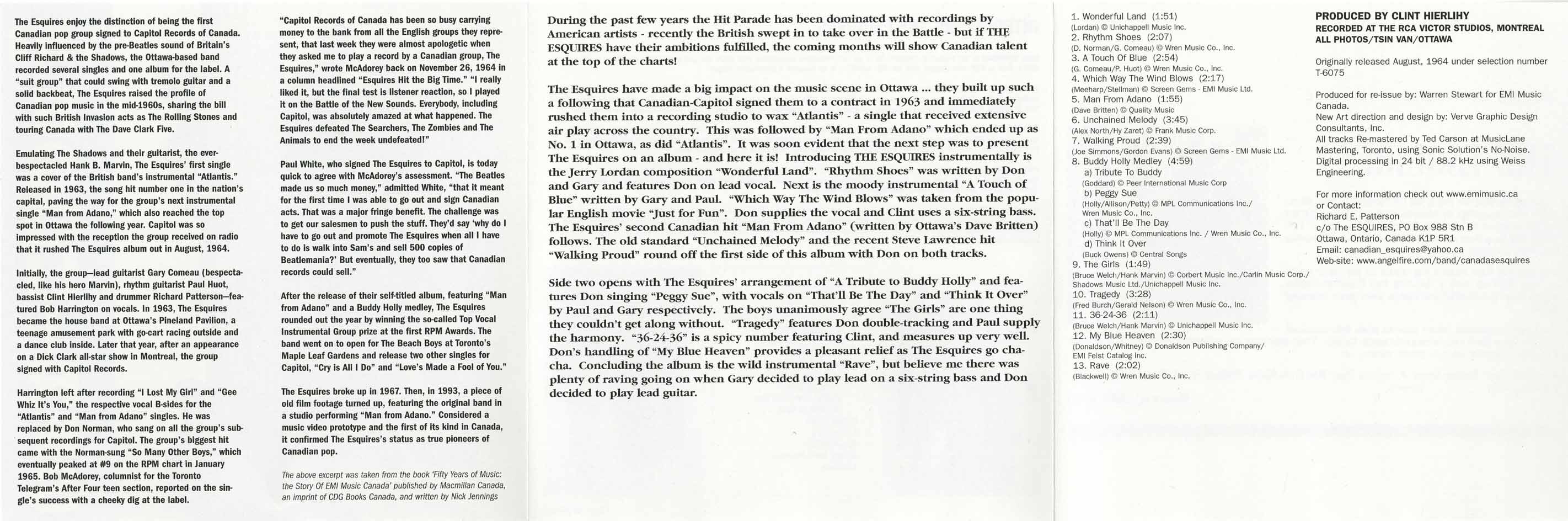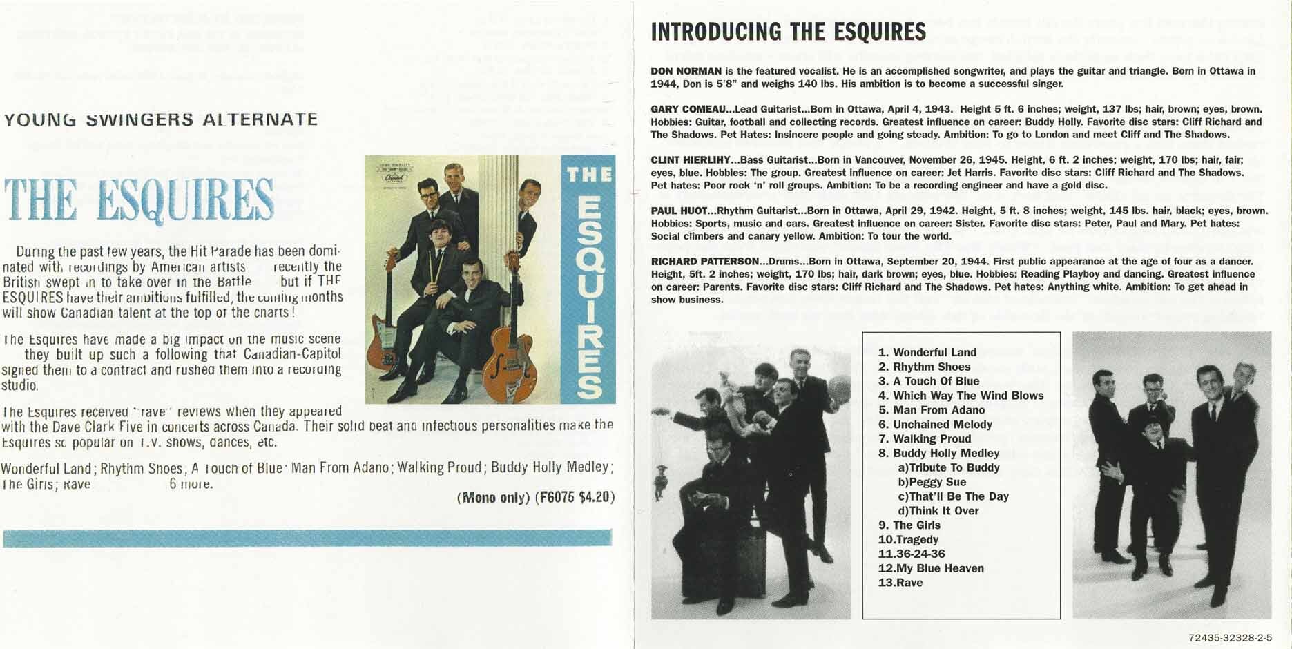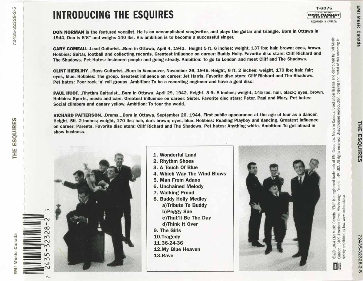The Esquires (not to be confused with the same-named R&B group The Esquires from Milwaukee, Wisconsin) were co-founded in Ottawa, in 1962, by Clint Hierlihy and Gary Comeau, while both were still in high school. The band developed a strong local following during the 1962-1963 period, modeling their sound on that of Cliff Richard and The Shadows. The group attracted the attention of Montreal singer Marty Hill. They were asked to back Montreal singer Andy Kim for his performance during Dick Clark's Caravan of Stars in Montreal, where the band played on the same bill as Gene Pitney, The Dovells,Johnny Tilitson, Paul and Paula and The Tymes.