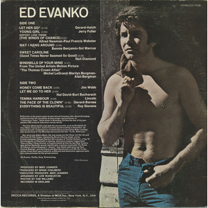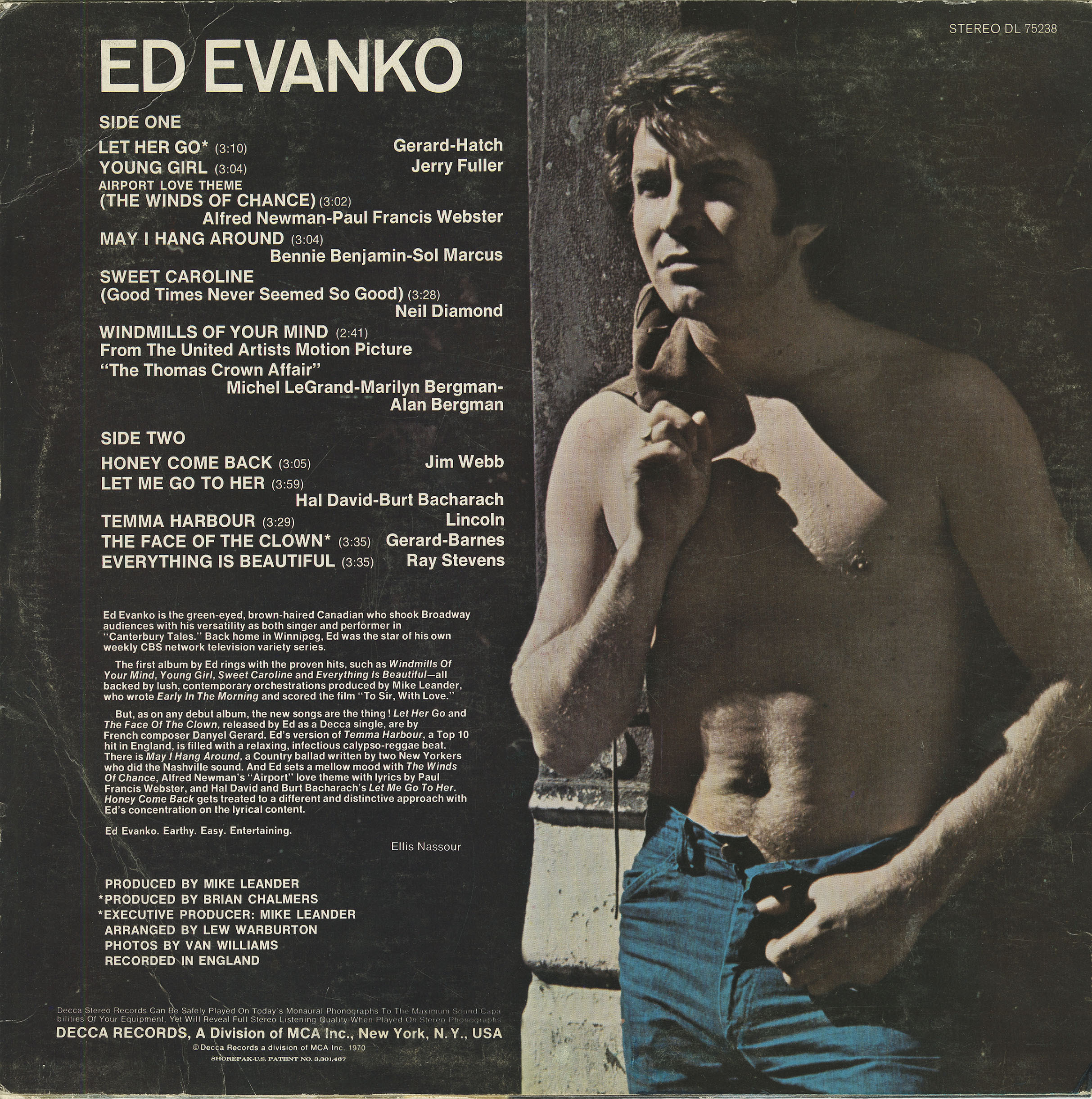 Evanko's recordings include cast albums for Rex (1976, RCA ABL1-1683) and Canterbury Tales (1969, Capitol SW-229), two albums of Ukrainian songs and arias and two solo albums of popular music, Ed Evanko (ca 1971, Decca DL-75238) and My Native Land (1983, Destiny BEL-83-2).