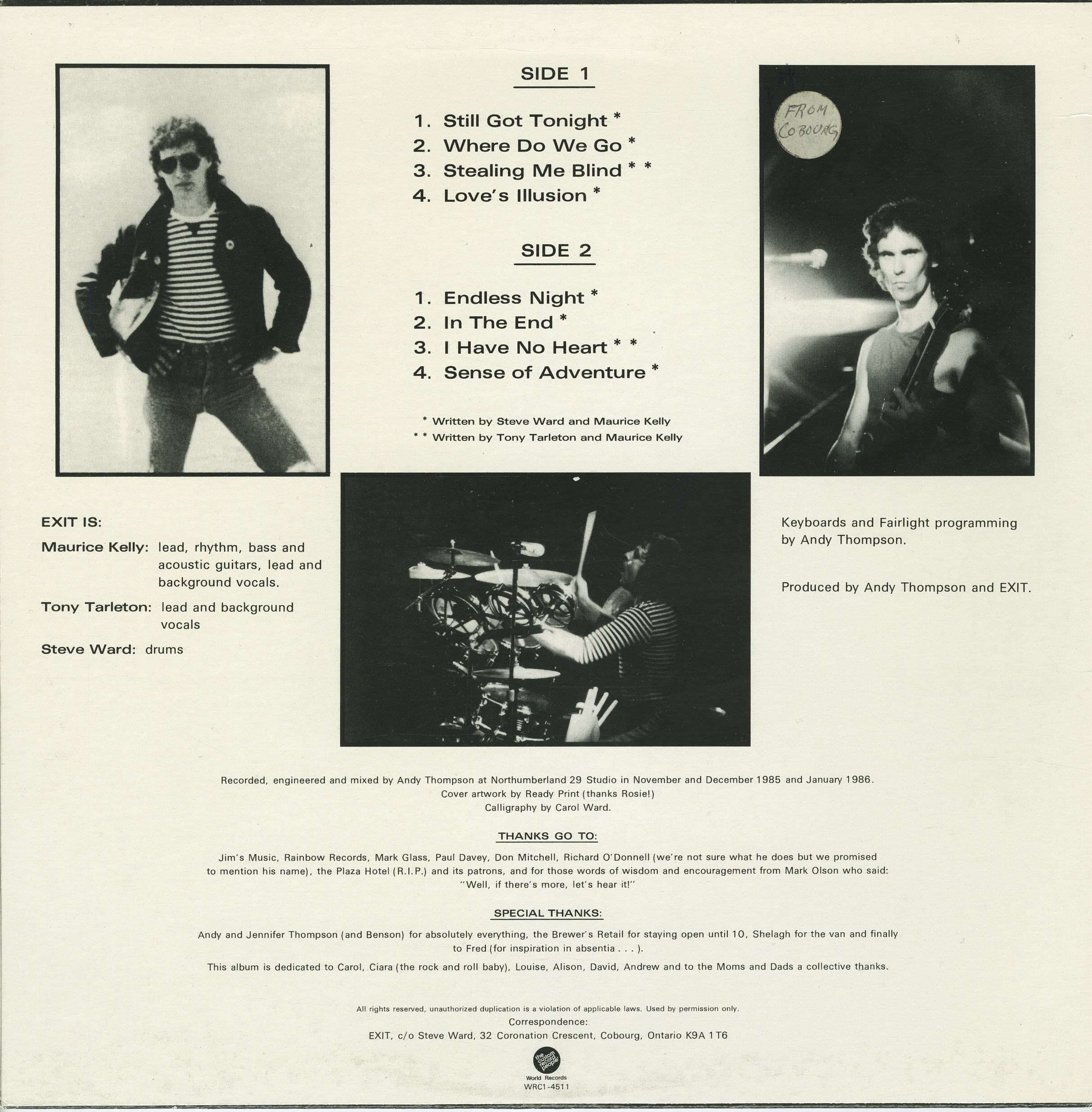 Recorded and mixed at Northumberland 29 Studio, Cobourg, Ontario in November and December 1985 and January 1986
