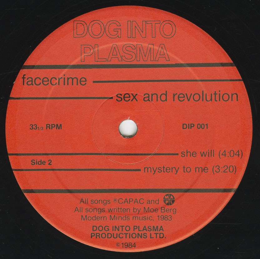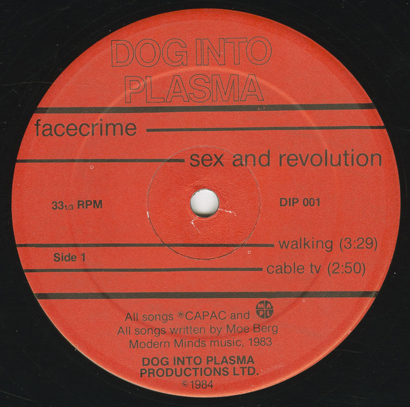 Building on that momentum, Facecrime released one rare but influential EP: Sex and Revolution (Dog Into Plasm, 1984). Recorded at Damon Productions in Edmonton and engineered by Clive Alcock, the record captured Berg’s evolving lyrical depth and musical sophistication. Tracks like “Walking,” “Cable TV,” “She Will,” and “Mystery to Me” explored themes of alienation, suburban discontent, and emotional conflict with sharp arrangements and an underlying pop sensibility.