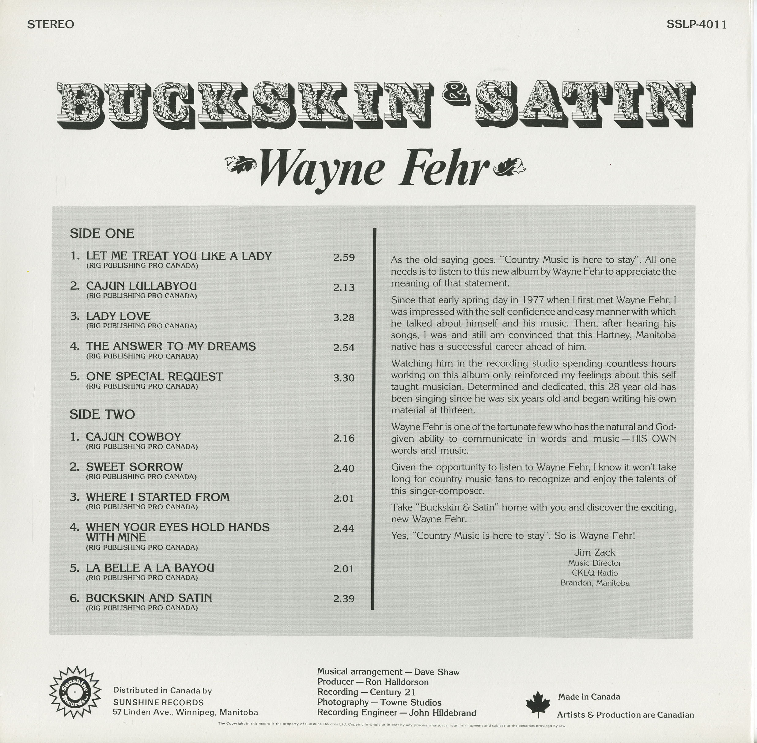 Fehr returned with a second LP, Buckskin & Satin, in 1978. If Mood Country was intimate and reflective, Buckskin & Satin broadened the picture, showing a writer equally comfortable with romantic ballads, prairie imagery, and radio-friendly country singles. The albumâs back-cover liner notes, written by CKLQ music director Jim Zack, praised Fehr as one of the rare artists able to communicate in âhis own words and music,â highlighting both his self-taught musicianship and his determination. Buckskin & Satin is confirmed as Sunshine Records SSLP-4011.