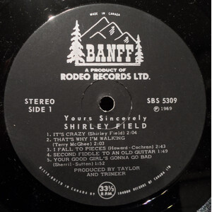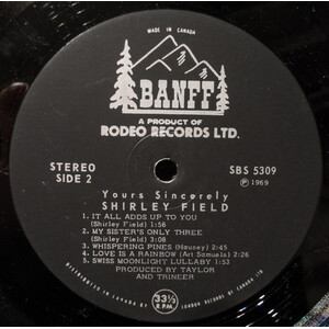 Throughout the 1960s, Shirley recorded a string of releases for the Rodeo/Banff and Melbourne labels — five singles in total between 1963 and 1969, alongside two full-length albums: The Two Sides of Shirley Field (Rodeo RBS-1186, 1963) and Yours Sincerely (Banff RBS-5309, 1969). Among her most collectible records is the 1965 Melbourne single “We’re Going Skiing” b/w “Ski Rock” (WG-3193), a rockabilly-inspired novelty cut that became a ski lodge favourite across Western Canada and remains a sought-after 45 among collectors today.