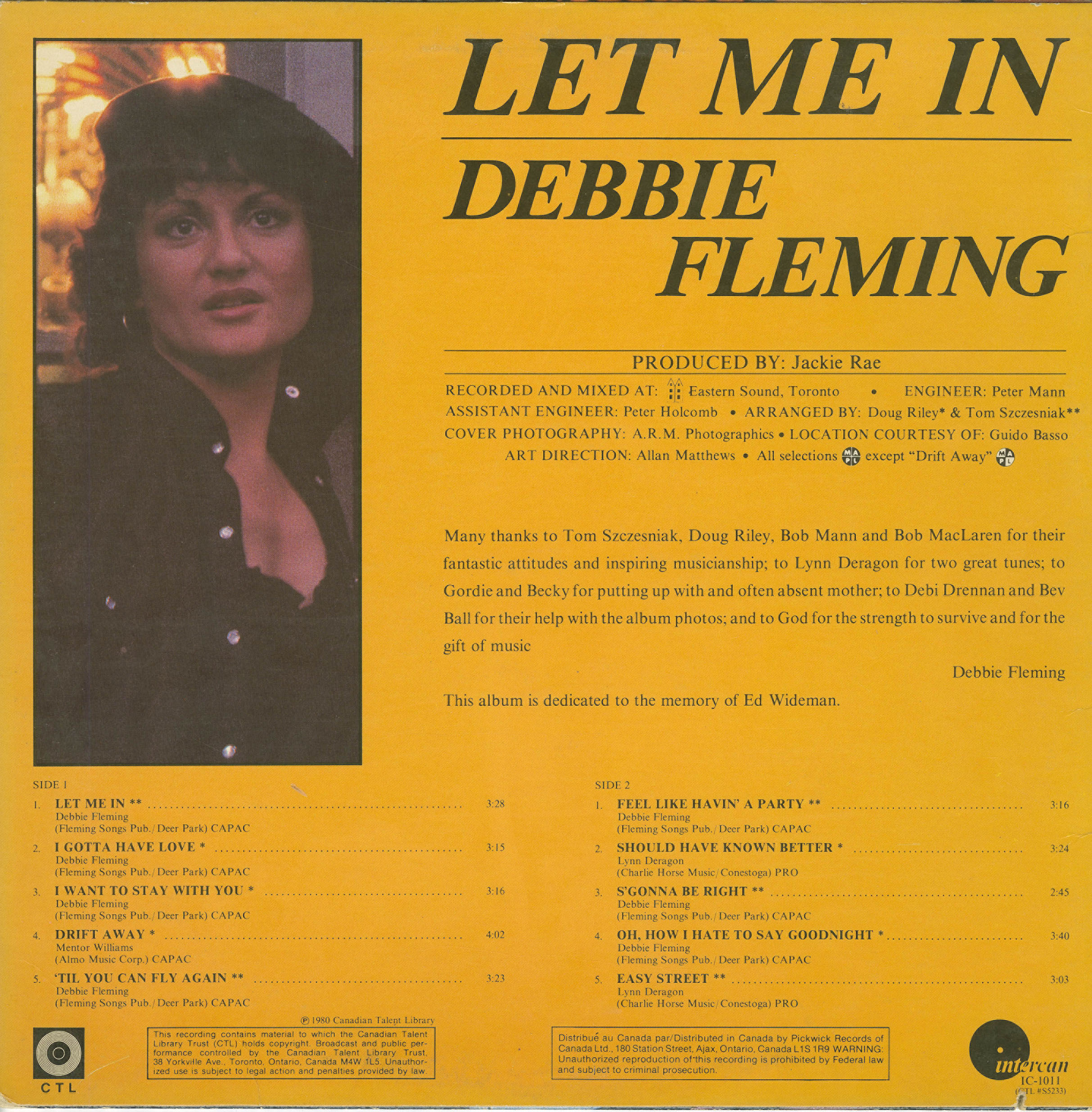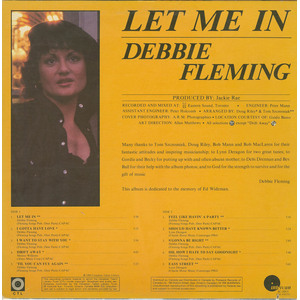 In 1979, Debbie came to the attention of Jackie Rae and Canadian Talent Library as a result of her work with other artists on the label, including Elaine Overholt and Doug Mallory. Her first solo album entitled “Let Me In” contained 7 of her own compositions, and 2 songs written by her friend and colleague Lynne Deragon. With musical arrangements by Tom Szczesniak and legend Doug Riley, this album, released in 1980, had a very favourable response in Adult Contemporary circles.
