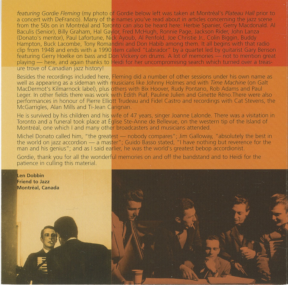 Shortly after her father’s death Heidi and I discussed the idea of this anthology and producer Jim West was also enthusiastic. He was relentless in her search and we have all been rewarded as you will no doubt agree after you’ve heard the material herein. Besides being, in my estimation, the greatest bebop accordionist, you’ll discover his versatility. You’ll find examples of the Canadian All Stars (both the studio New York date with Yvan Landry on piano and live with the latter on vibes); this recording from the historic Charlie Parker Chez Paree concert of 1953). What else: there’s a sixteen year-old Fleming on a short Caravan recorded in Winnipeg with organist Ethel Lowe (dedicated to his “mom and dad”) as well as another snippet of the same tune and “A Man With A Million Dollars” (one associated with Joe Mooney) by the wonderful little trio led by bassist Rob Adams, a group I remember best from a radio show called Time, Space and Echoing Themes. There’s also a medley of the Quartones (Frank Quinn, Gerry Macdonald, Gordie and Leo Poulin) and a cut from Gerry Macdonald’s Choice label 1977 recording title Waterbed: Buddy DeFranco featuring Gordie Fleming (my photo of Gordie below left was taken at Montréal’s Plateau Hall prior to a concert with DeFranco). Many of the names you’ve read about in articles concerning the jazz scene from the 50s on in Montréal and Toronto can also be heard here: Herbie Spanier, Gerry Macdonald, Al Baculis (senior), Billy Graham, Hal Gaylor, Fred McHugh, Ronnie Page, Jackson Rider, John Lanza (Donato’s mentor), Paul Lafortune, Nick Ayoub, Al Penfold, Joe Christie Jr., Colin Biggin, Buddy Hampton, Buck Lacombe, Tony Romandini and Don Habib among them. It all begins with that radio clip from 1948 and ends with a 1990 item called “Labrador” by a quartet led by guitarist Gary Benson featuring Gerry Hoelke on bass and Don Vickery on drums. A lot of memories — not to mention great playing — here, and again thanks to Heidi for her uncompromising search which turned over a treasure trove of Canadian jazz history!