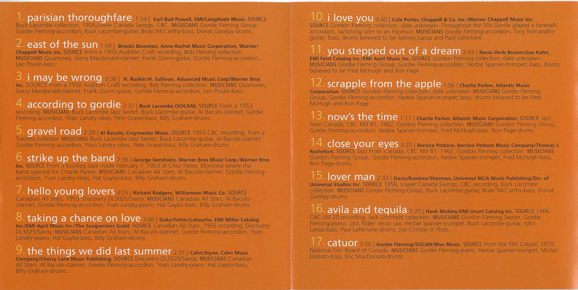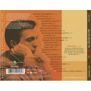 Thanks / Merci – Len Dobbin, Joanne Fleming, John Drew Munro, Paul Baran*, Jim West, Laval Côté, Jadranka Subic, Reid Morris and Justin Time, Barbara Brown* & the CBC, Richard Greene* and the National Library of Canada, Daniel Vachon* & Radio Canada, Graham Newton, Jim Rabchuk, Rob Adams*, Buck Lacombe*, Dana Whittle, Al Penfold, Larry Cassini, Gary Cristall, Nancy Marelli, Bob & Arlene Fleming*, the Fleming children, André & Keith White*, National Film Board of Canada*, Dan Marks*, Alan Bates, Michael Melford, Kinsey Posen, Warren Chiasson, Michel Godin*, Canadian* and Quebec National Archives, Jack Litchfield*, Lyman Potts, Michel Donato, Tony Romandini, Phil Antonaci Jr.*, François Bourassa, Andrew Homzy, Johnny Lanza, Paul Lafortune, Al Baculis, Yvan Landry, Hal Gaylor, Bob Roby*, Sabine Assuied, Sang Hee Park, Janet McClelland, Zeina H. Saleh, Mrs. Gerry MacDonald, Mark Miller, Plateau Musik, Gilles Garand, Babs Pitt, Jeff Healey, Walter Lipiec*, Peter Soave, Harold Smith, Ira Gitler, Art VanDamme, Christian Marcon, Reynald Ouellet, Richard Ring, Marin Nasturica, Bob Sunenblick, SOCAN, Canada Council for the Arts, Jack Fortin, Joaquin Diaz, Glen Sarty, Simon Pressey, Edouard Dumoulin, Owen Clark, Lyman Potts, Dave Lennick*, Jimmy Amaro, Johnny Maloney, Barry Graham, Sheila Graham*, Graham Henderson, Neil Chotem, Crayne Spanier, Addie & Marie Schiavo, Gary Benson, Leslie Mitchell Clarke, Robert Guérin, Christiane Girard, Gaye Hardiman, Fred Grenon and in memoriam, Billy Graham, Gerry Hoelke* and Paul Grosney, ainsi que tous les musiciens qui se son déjà rendus à leur ”gig” ultime- and most of all, Gordie.