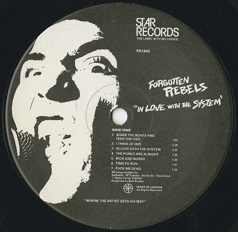 April 7, 1980: 'In Love with the System' LP cover design finished. Concept by myself and Richard Chomko. Tuesday April 29, 1980 - I am informed by Brian Simpkins, manager of Golden Records (record plant) that 3 of Toronto's printing houses will not, I repeat will NOT print The Forgotten Rebels album cover or insert because of profanity. I quote Luis Bunuel to myself: 'In a world as badly made as this one, there is only one road - rebellion.' Despite all of our efforts to convince the printers to do the job - we are 'forced' to black out the title of one of the songs on the back cover if we want the album out on time. We are working on getting a Ramones show for the area and having the Rebels open up. Wednesday, May 14, 1980 - The Forgotten Rebel 'In Love with the System' LP is released on Star Records - The Label with No Choice. Wednesday, May 21, 1980 - The Ramones come to Star Records, Hamilton for an autograph session. That night The Forgotten Rebels open up for them in Burlington. The agreement was The Rebels could open for the Ramones if they did NOT play 'I Wanna be a Nazi'. Of course, they did. Still in search of the perfect haircut. June, 1980 - I spend assuring the entire civilized world that The Forgotten Rebels are not, I repeat NOT a neo-nazi organization bent on world conquest. It starts with a gentleman who attends the Ramones/Rebels show who happens to have lost his whole family in the holocaust. He is so outrages by 'Nazis' that he call the office of the Attorney-General who proceeds to call the Burlington Police. On Wednesday June 18, I meet with Sgt Sullivan and detectives in Burlington who have an actual copy of 'In Love with the System' with insert. I assure them that these 'kids' are 'harmless' (are they really?) And that they are simply total knee-jerk reactionaries who will do anything to shock you - bur there's nothing much behind it. This seems to satisfy the police and the Attorney General BUT NOT, I REPEAT NOT CFNY. (Believe it or not - that bastion of 'alternative' music was the most offended party. Mainly because of 'Third Homosexual Murder' on the EP.) Backtracking a little - on June 10, 1980 - I had to meet with David Marsden and other staff of CFNY to assure them that The Forgotten Rebels will really not shoot you if you're gay - but that song was merely their way of 'reporting'. I still doubted we were going to get any airplay - and we didn't. It seems everybody misses that strategic verse in Mickey's song 'Nazis' where he says: 'You'd have to be quite an idiot...to believe in this mess.' (Source: Bob Bryden's website)