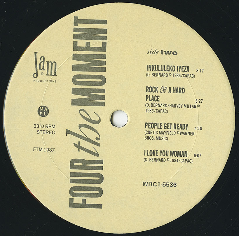 In 1987, Four the Moment made the album We're Still Standing (JAM FTM 1987) and recorded two songs with Lillian Allen for her LP Condition Critical. It also performed in the film Black Mothers, Black Daughters (NFB 1990), the title of which was taken from the refrain of Bernard's 'I Love You Woman'.