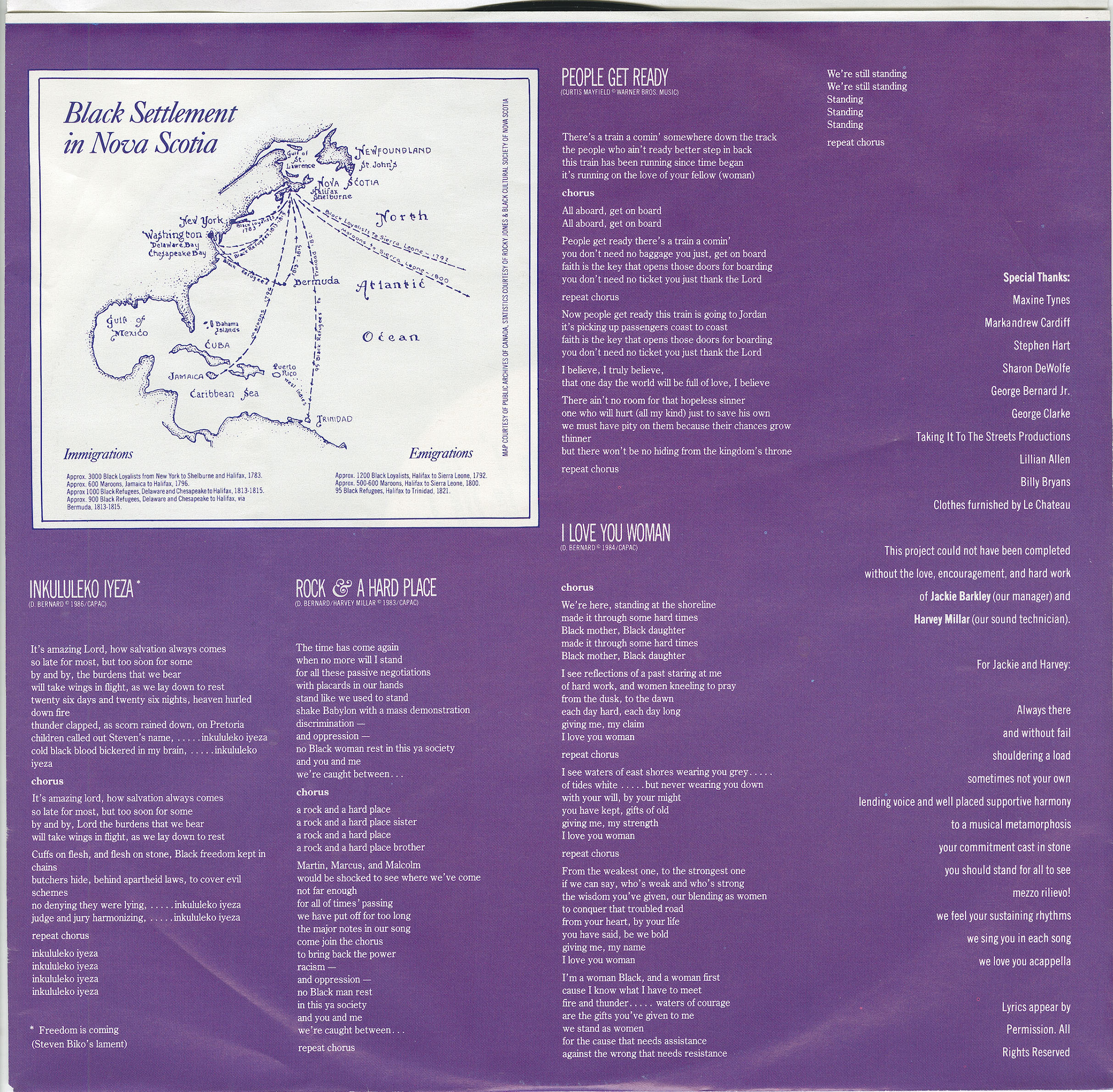 Its songs, many written by Delvina Bernard (some with lyrics by Halifax poet George Elliott Clarke), are of a political nature - eg, about Black history in Nova Scotia ('Africville,' 'West Hants County,' etc), women's struggles, and South Africa. Bringing the influence of R&B and reggae to what is at base a gospel format, Four the Moment has appeared at folk festivals, women's events and black culture celebrations across Canada, and performed at Expo 86, the Olympic Arts Festival (Calgary 1988), the Ottawa International Jazz Festival (1989) and Sound Symposium (St John's, Nfld, 1990). It has also been heard widely on CBC radio variety programs.