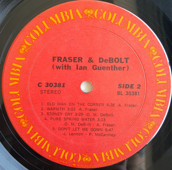 The reason for all of this passion is the same reason the record sold squat: it's full of gorgeous ragged edges and inspired imperfections. It's human and heartfelt with no pretense or gloss. We're not talking idiot savant (I won't name examples here, as I don't want to offend anyone); it's as insulting to Fraser & Debolt to lump them with "real people" or "incredibly strange" music as it would be to Bobb Trimble. Every out of out-of-tune violin lick (courtesy of Ian Guenther, who gets credit in the album title), every backing vocal that starts too early or comes in too late, and every dissonant guitar chord is intentional (or at least a brilliant performance accident retained after much thought.) This may be raw; it may be loose, and it sure is fun, but this album is arranged with as much foresight as any 70s prog record. On all but one song (which adds sax and piano) the musical backing is merely two acoustic guitars and violin, often arranged with a punk-like simplicity. Yet every song sounds full and rich, each is different from the others, and the unique approach to dual vocals fills the songs with left turns, sublime beauty, and moments that will make the most jaded listener smile. It's been called "art-folk," which is as good a description as any. It's also rock and roll without electricity or drums, and acid folk without any of the daze or confusion.
