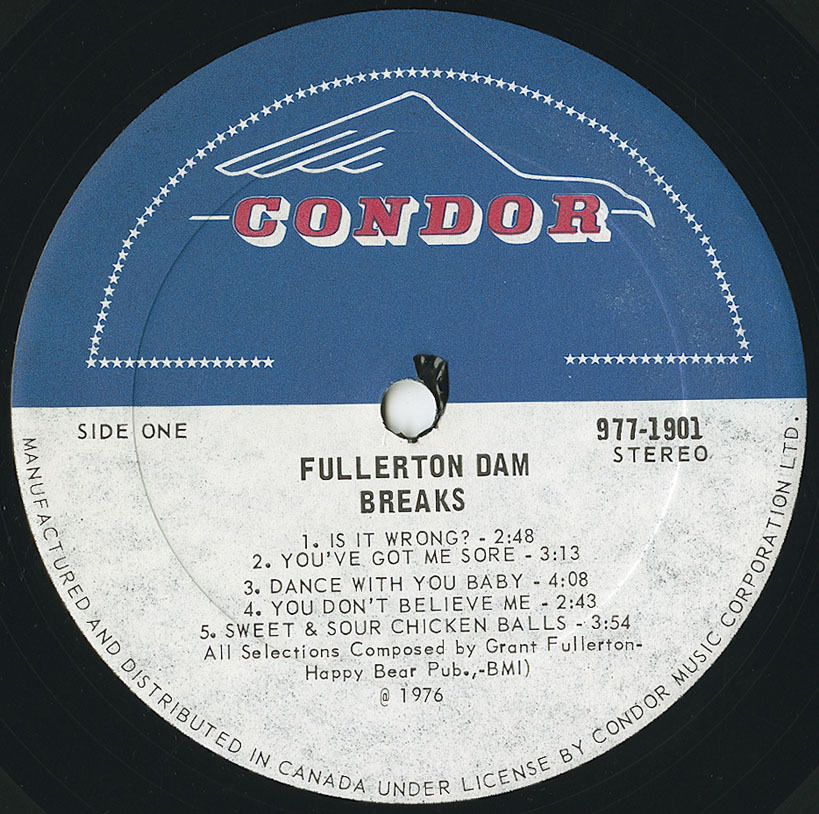 Fullerton Dam formed in 1974. They released four singles on Polydor Records before recording one album with Condor Records. The album came with two different covers. The Fantasy cover sells for about twice as much as the pink cover. In 1977, they formed the Madcats with Grant Fullerton, Bobby Blake, Brad MacDonald, Glen Gratto and John Erdman. They released one album and a few singles. In 1981, they formed The Grant Fullerton Band with Grant Fullerton, Brad MacDonald, Rod Blacker and Steve Campbell, and recorded a mini 4 track album and single.