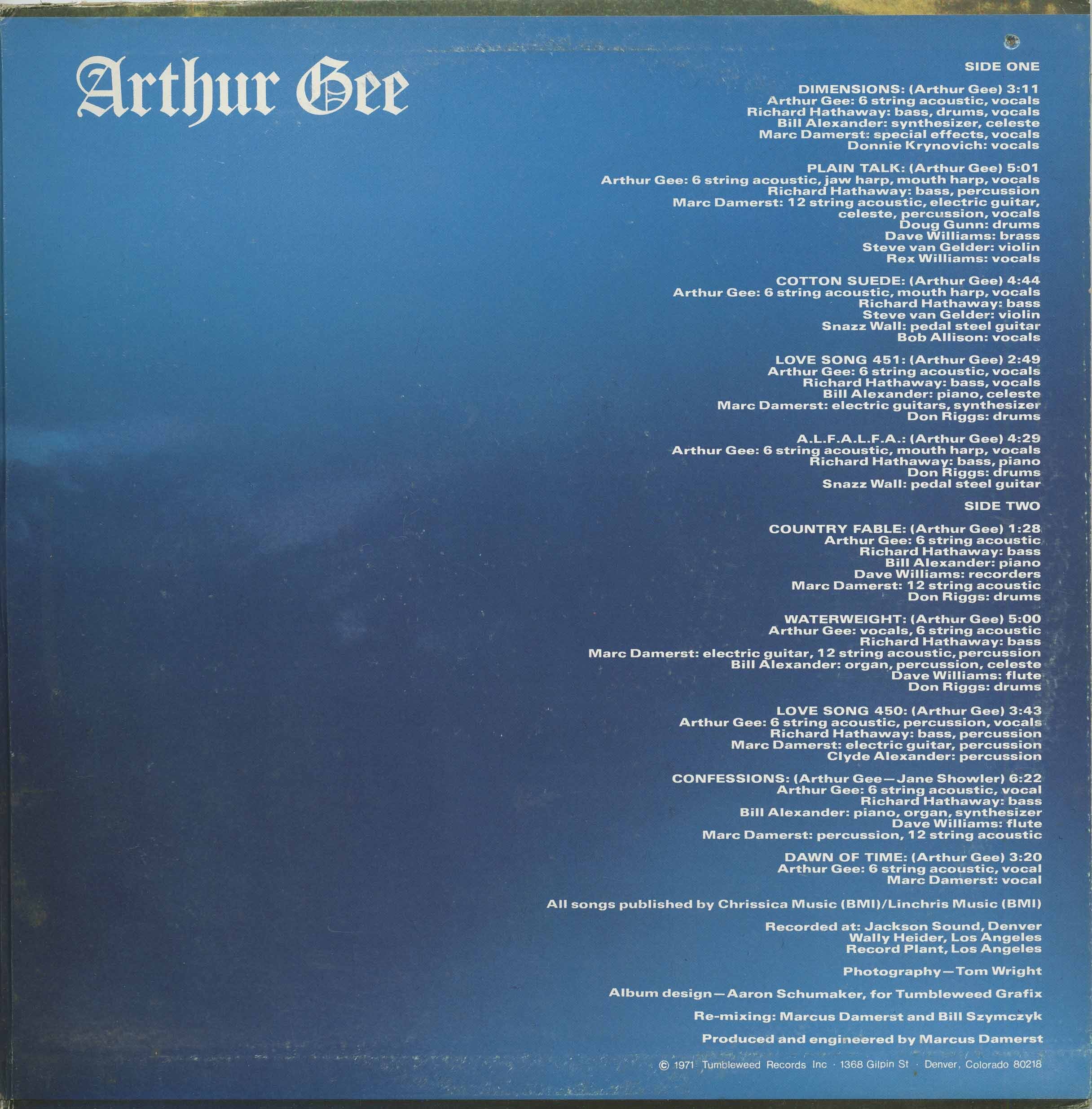 Gee's real debut LP is also the first release on the Tumbleweed label, and a fine start for both. Upscale, intricate production typical of the label with Arthur's atmospheric voice given an appropriate context that involves a full folkrock setting plus bells, violin, even jew's harp. Opens on a strong psych vibe, then goes through various chameleon tricks including outlaw country, Tim Hardin folk, and some obvious Dylan "Blonde On Blonde" moves. It's all quite appealing and held together by the expensive, elaborate arrangements. The LP has obvious 60s remnants and is less singer/songwriter than most Tumbleweeds. Two tracks from the Two:Dot demo LP appear in more elaborate versions, although I prefer the sparser 1969 sound of "Meditations". Easy to find and well worth checking out. Gee's second LP for Tumbleweed ("City Cowboy", 1972) is inferior in a countryrock direction.