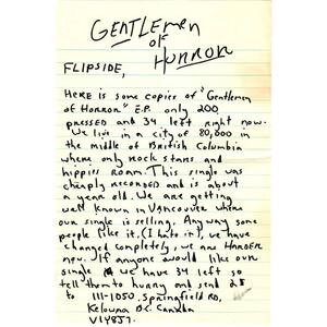 This was the only release by GOH. It was recorded in November of 1980 in Donny Walchuk's basement and released in January 1981. It was recorded for $60 in one evening, live to a reel to reel 4-track, with the vocals overdubbed. We pressed 200 copies (at Praise Records in Vancouver-a Christian pressing company!) with blank, white labels and hand drew on them with coloured felt markers, saving a $50 printing charge. Every label was unique; some had the songs titles, some had things like "Virgin Records" and anarchy symbols on them, one even had a very good likeness of Barney Rubble drawn by Tom.