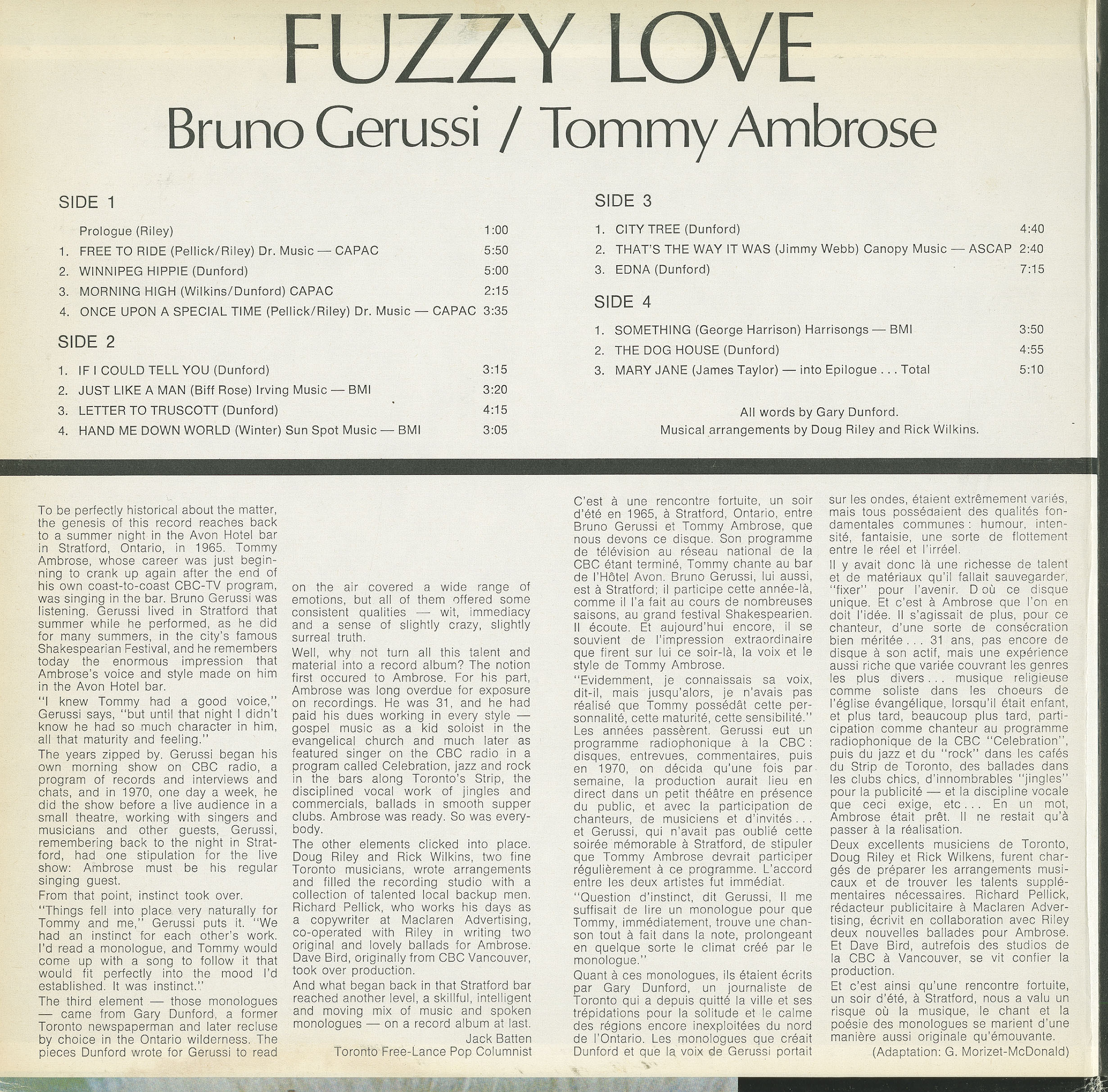 This offbeat collaboration by two Canadian entertainers and a reclusive poet was borne out of the CBC radio show Words And Music hosted by actor Bruno Gerussi in the early 1970's. The weekly show featured interviews, music and monologues done before a live audience in a small theater. Tommy Ambrose was a regular singing guest. "We had an instinct for each other's work" Gerussi said. "I would read a monologue and Tommy would come up with a song to follow it that fit perfectly into the mood we established." The monologues were written by Gary Dunford, a former Toronto newspaperman who became a recluse by choice in the Toronto wilderness. His pieces covered a wide range of emotions but all of them offered wit, immediacy, and a sense of slightly crazy, slightly surreal truth.