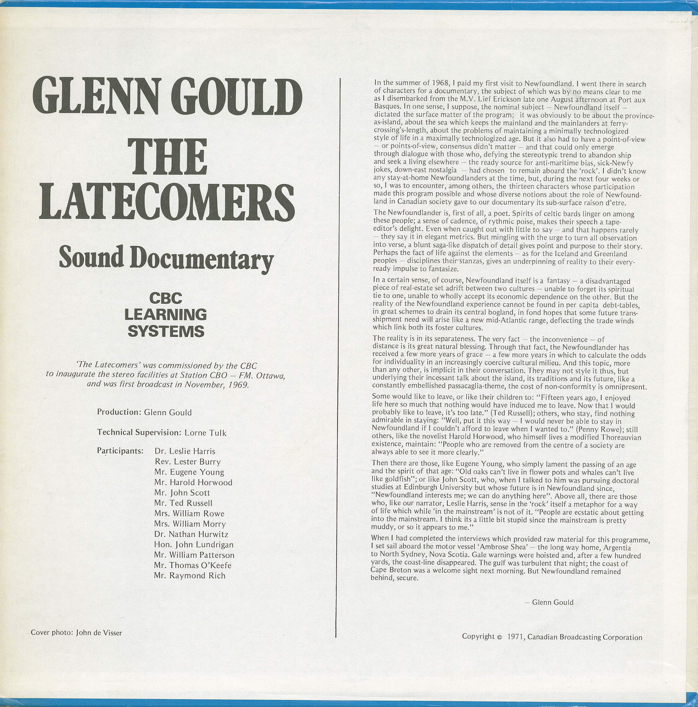 In 1969, Gould made The Latecomers, about life in Newfoundland outports, and the province's program to encourage residents to urbanize.