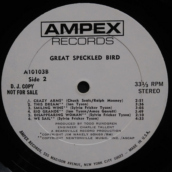 The material on Great Speckled Bird was about evenly divided between songs written either by Ian Tyson or Sylvia Tyson, though the pair collaborated on "Calgary," and Garrett got a co-credit with Ian for "Rio Grande." The sole cover to find its way onto the LP was "Crazy Arms," a huge country hit for Ray Price in the mid-1950s, and subsequently covered by everyone from Jerry Lee Lewis, Willie Nelson, and Chuck Berry to Linda Ronstadt, Patsy Cline, and Waylon Jennings. "Ian and Sylvia's album was the first record of its kind cut in Nashville," N.D. Smart observed in John Einarson's Desperados: The Roots of Country Rock. "They couldn't get used to the longhairs. They all figured that you had to have the hit done before lunch or there was something wrong with you. But we weren't in there for two or three hours watching the clock. We were in the studio for eighteen hours at a stretch. And [Nashville session men] David Briggs [on piano] and Norbert Putnam [on bass] were loving this, because they were getting triple scale."