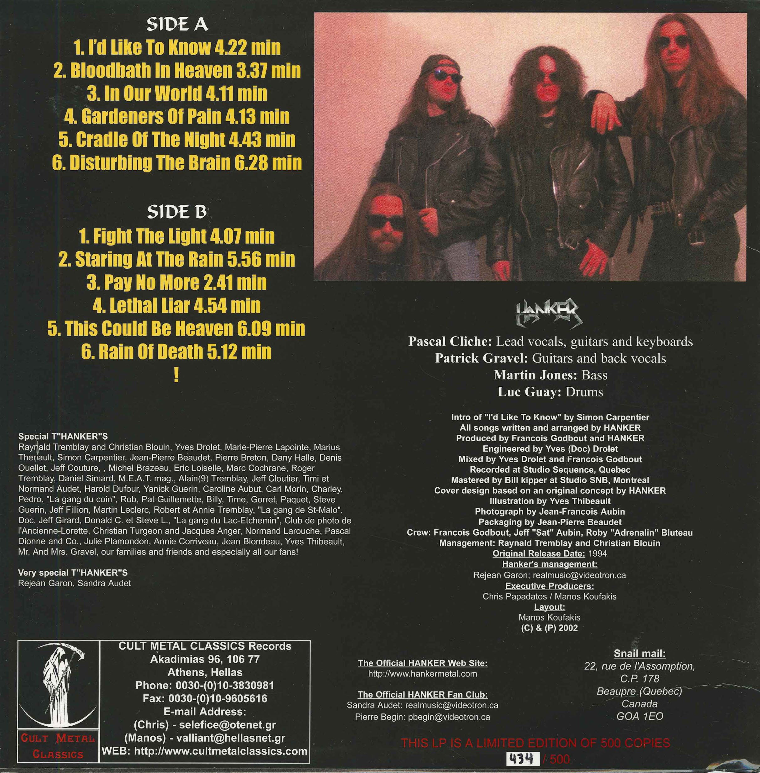 Quebec, Canada's curiously named heavy metal band Hanker got their start in 1985, but would have to wait nearly a decade before releasing their debut album, In Our World, in 1994. A very respectable first outing it was, too, with vocalist, guitarist, and keyboardist Pascal Cliche, guitarist Patrick Gravel, bassist Martin Jones, and drummer Jean-Francois Fillion revealing obvious but perfectly adequate influences from Iron Maiden, Jag Panzer, and other classic metal bands. These influences carried over into the band's sophomore effort, The Dead Ringer, three years later, which, like its predecessor, had to be financed and released by the band themselves, in lieu of any record company interest. That finally changed when 2000's Snakes & Ladders found Hanker hooking up with Metal Disk, and then Skyscraper Records for 2004's Web of Faith album. The latter pair also introduced a new rhythm section of bassist Denis Cossette and drummer Luc Guay.