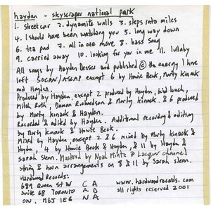 Now, after a three-year hiatus, Hayden has returned with his third LP, Skyscraper National Park. The album casts Hayden as older, wiser and more reflective. Hayden is still a man steeped in his own sensitivity, but he's changed a bit with age. Youthful, idealistic romance has grown into love, hopefulness into doubt, and anger into distance. Accompanying his maturity is a newfound and uncanny sense of restraint that both binds the disc and renders his passion haunting and compelling. Not once does Hayden burst into a growl. Instead, the album is marked by frequent reliance on a simple falsetto.