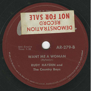 I - 1957 - Saw him in Aragon's Recording Studio cutting a song he penned "Want Me a Woman" and one that Rudy Derton wrote "Blue Steel". "Want Me a Woman" was well received in Europe. This song was included on a Netherland's label "Early Canadian Rockers". Rudy Hayden was the first Canadian artist to write and record a rockabilly tune, "Want Me a Woman" in Canada.