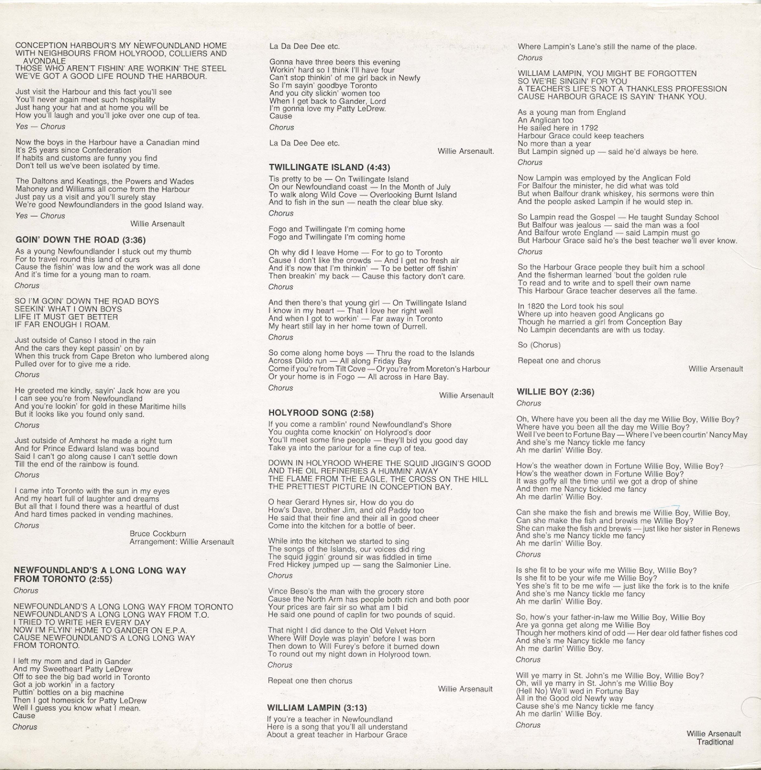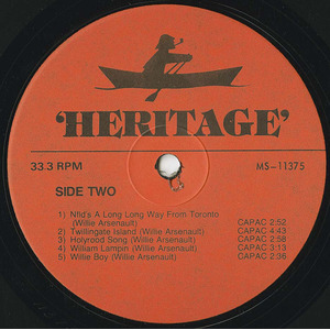 Heritage released this fabulous example of Newfandlandia in 1975 on their own private label, Heritage H.T. 0100. It was recorded by Jack Windsor at Echo Recording Studio, St. John's, Newfoundland. The album features nine compositions, all written by Willie Arsenault.