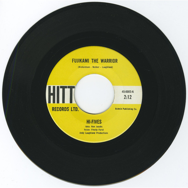 "Fujikami The Warrior" by The Hi-Fives is completely like any other record I have ever heard. It was originally a saxy instrumental until the producer, disc jockey Andy Laughland, decided that it didn't sound commercial enough. The title was changed, and a new Ghengis Khan type character was born. Instead of the sax as lead instrument, we now got fellow disc jockey Frosty Forst's maniacal pseudo-oriental Samuri voice intermittently squeezing out such droplets of information as - "Fujikami the warrior has the world's greatest fan club. I am President, Vice President, and Secretary-Treasurer!"