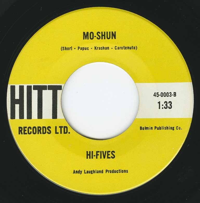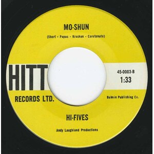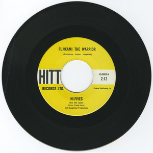 Anticipating John Belushi's Saturday Night Live samurai by fifteen years, the Hi-Fives' "Fujikami The Warrior" (Hitt 003, released locally in Vancouver, B.C. in 1961) was a bizarre novelty tune filled with the demented shrieks of a local radio personality-gone-nuttily Nipponese TOTALLY unlike anything else the group ever performed before or afterward. This anomaly, unfortunately, represents 50% of their recorded output forever linking them with such stellar luminaries as Weird Al Yankovic. In truth (so it is claimed), the Hi-Fives were a serious blues band. Their REAL members ("Fujikami's" shrieks were merely those of guest deejay "Frosty" Forst) included Harry Walker (vocals); Freddy Carotenuto (saxophone); Tab Shori (guitar); Bill Papuc (bass); and Red Lewis/Larry Krashin (drums). The group's OTHER single, "Mean Old Woman" b/w "Cold Wind" (London 17200), allegedly more representative of their TRUE sound, reveals the Hi-Fives as slavish impersonators - content to regurgitate rather than reinterpret mainstream blues. Even with such faults, however, "Mean Old Woman" hit #7 in Los Angeles upon its U.S. release (on the Era label). During their six year association, the Hi-Fives won several Battles of the Bands in Vancouver, and evidently drew crowds to local nightspots like the Blues Palace - where they once headlined with Ike and TinaTurner. Given their popularity, one wonders if two studio 45's - one atypical and the other quite frankly a disappointment - really did justice to their live act (saxman Carotenuto hints that they did not). The point, of course, is now moot. Interested parties are referred to the History Of Vancouver Rock, Volume 1 (Vancouver Record Collectors' Association VRCA 003, 1987) for the A-sides of both singles.