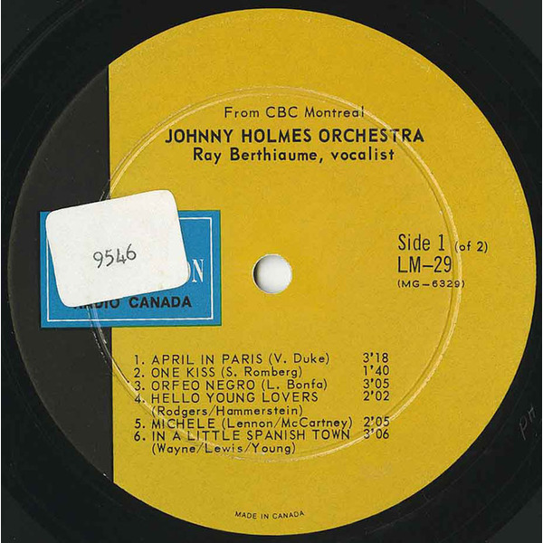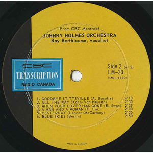 After retiring from music in 1951, Holmes returned in 1959 to front orchestras for CBC Radio. Throughout the 1960s he was heard regularly on programs like The Johnny Holmes Show and Broadway Holiday, blending Broadway sparkle, light music, and jazz into a polished orchestral style. Between 1966 and 1973 he recorded a total of six broadcast-only albums and singles for the CBC’s LM (Light Music) series. These were pressed in tiny quantities and distributed in plain stock sleeves, never sold commercially. Among them were two sought-after LPs — Johnny Holmes Orchestra – Ray Berthiaume and Margo McKinnon, vocalists (CBC LM-16, 1966) and Johnny Holmes Orchestra – Ray Berthiaume, vocalist (CBC LM-29, 1967). He then experimented with a brass-heavy ensemble under the name Brass Therapy, recording CBC LM-164 (1971, released 1973) with “Close to You,” “So Nice,” “Wave,” and “Lollipops and Roses,” and CBC LM-192 (1972), featuring For Once in My Life (arranged by Holmes), Love Story (trombone feature for Claude Blouin), Watch What Happens (guitar feature for Tony Romandini), and Lonely Is the Name. In 1972 Holmes also cut CBC LM-207, a 45 pairing Gordon Lightfoot’s “If You Could Read My Mind” and Gene MacLellan’s “Put Your Hand in the Hand” with his own composition “Rainbow” and MacLellan’s “The Call.” His final entry came with CBC LM-266 (1973), a 45 featuring “Si tu parais” and “Alouette.”