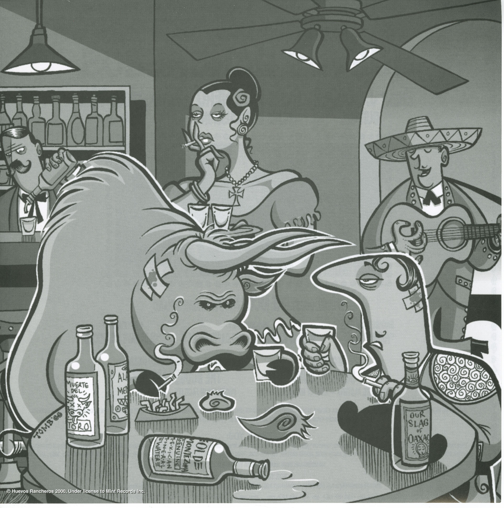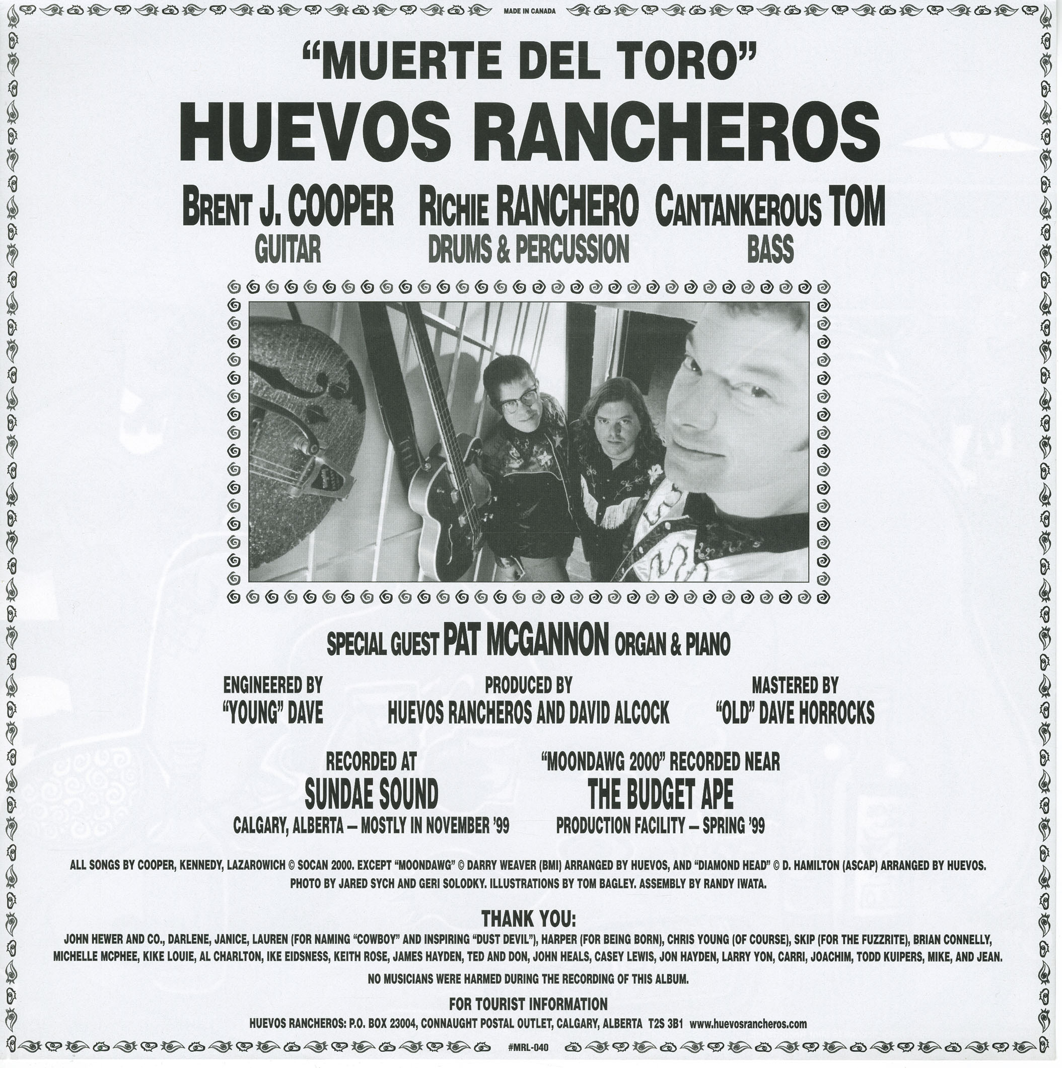 Work on the band’s fourth full-length album occupied much of 1999 and early 2000, coinciding with Huevos Rancheros’ tenth anniversary. Released in May 2000, Muerte del Toro (Death of the Bull) was recorded at Sundae Sound in Calgary with producer Dave Alcock of Chixdiggit and marked several firsts for the band, including organ and piano contributions by Pat McGannon and Mint Records’ first vinyl LP release by the group. A video for Diamond Head followed, along with extensive touring.